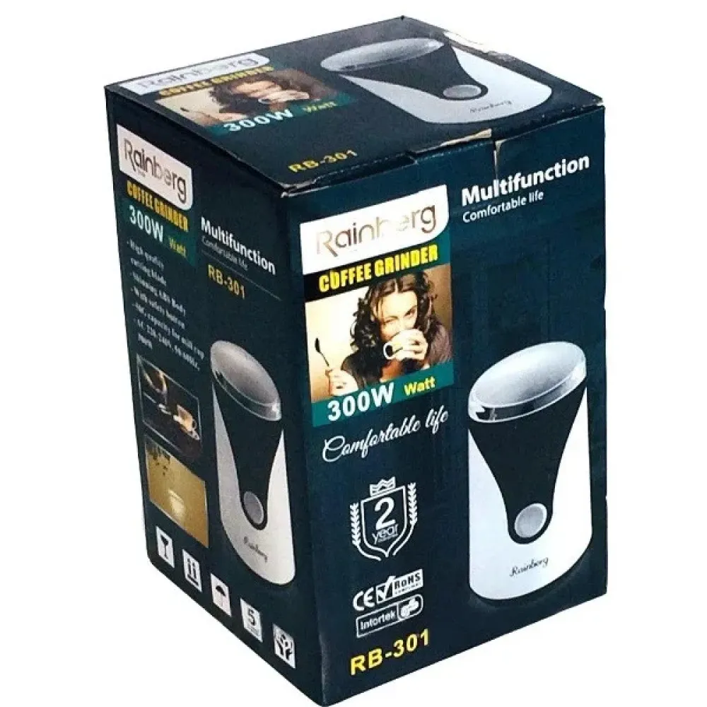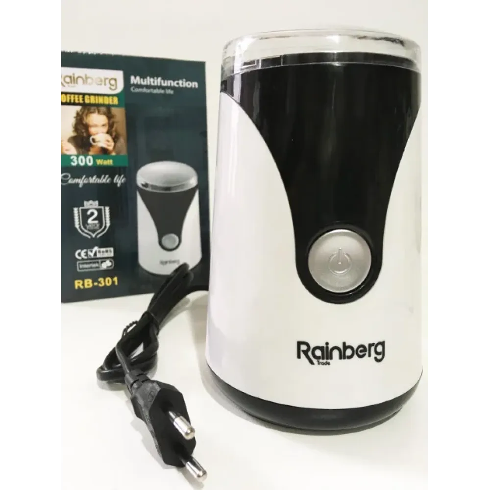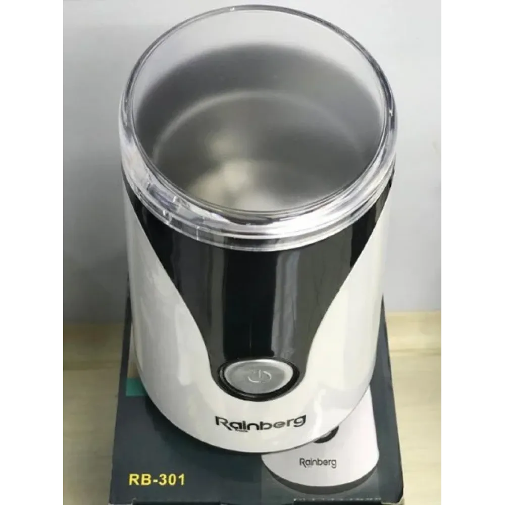 Кофемолка Rainberg RB 301 мощностью 300W способна за минимум времени измельчить около 50 грамм кофе в зёрнах всего лишь несколькими нажатиями кнопки на корпусе электронного устройства.