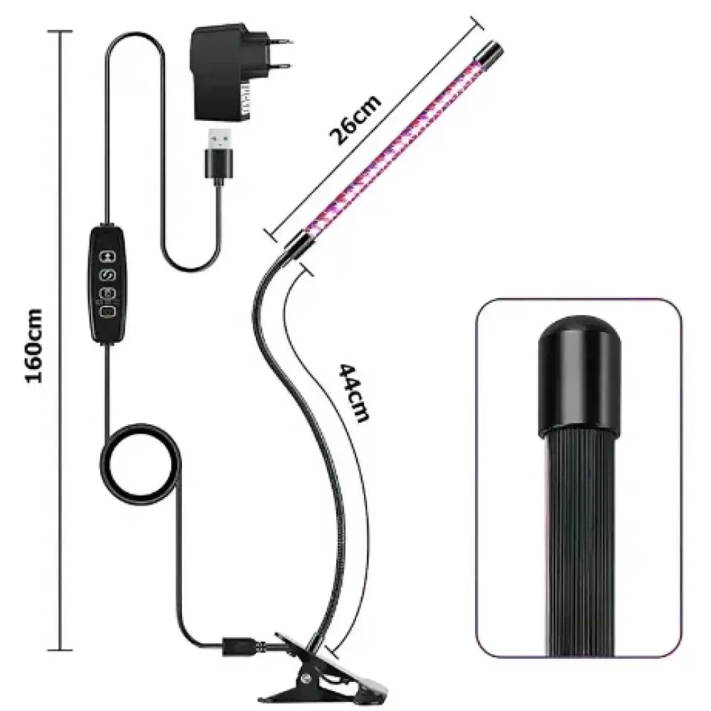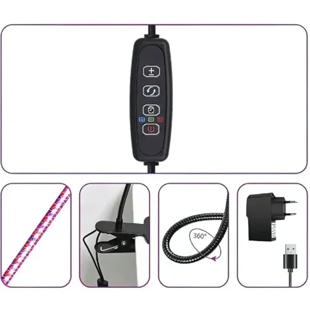 Одинарная гибкая фитолампа для растений с таймером ∙ Регулируемая яркость ∙ 15Вт