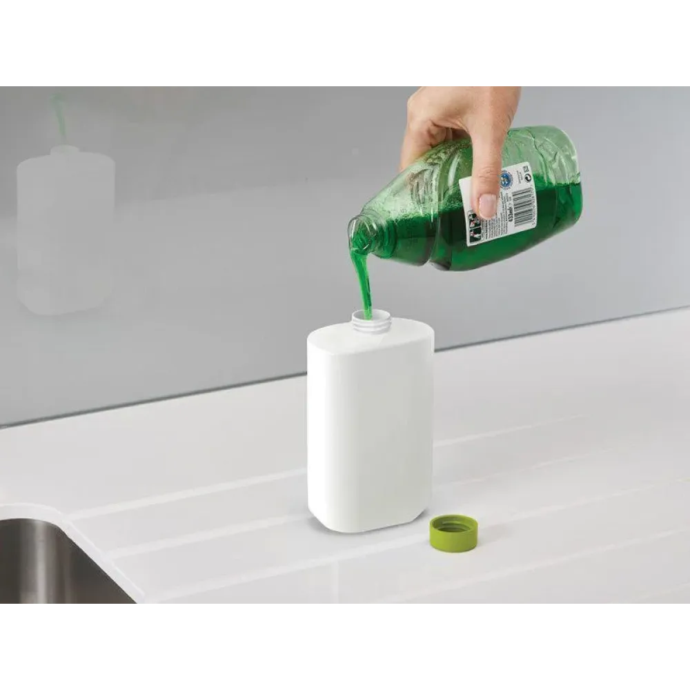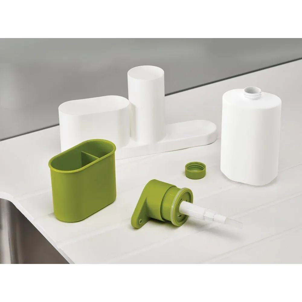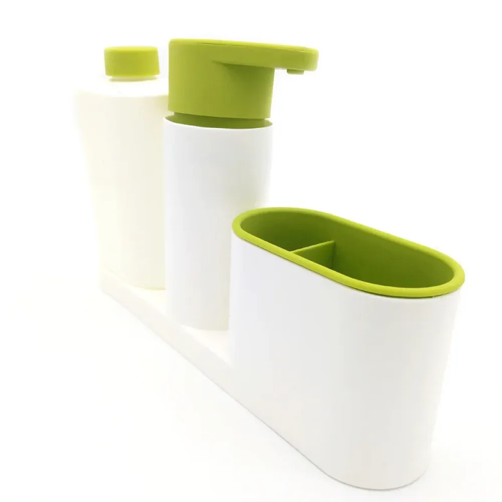 Органайзер Sink Tidy Sey Plus 3 в 1 предложен в белом цвете (основной цвет) с каймой и крышками салатового цвета. В нем предусмотрена подставка с двумя отделениями для щеток и губок, емкость для жидких моющих средств и дозатор для мыла. Все что необходимо, присутствует в одном наборе. Это очень удобно, а потому каждая хозяйка придет в восторг от такого презента.