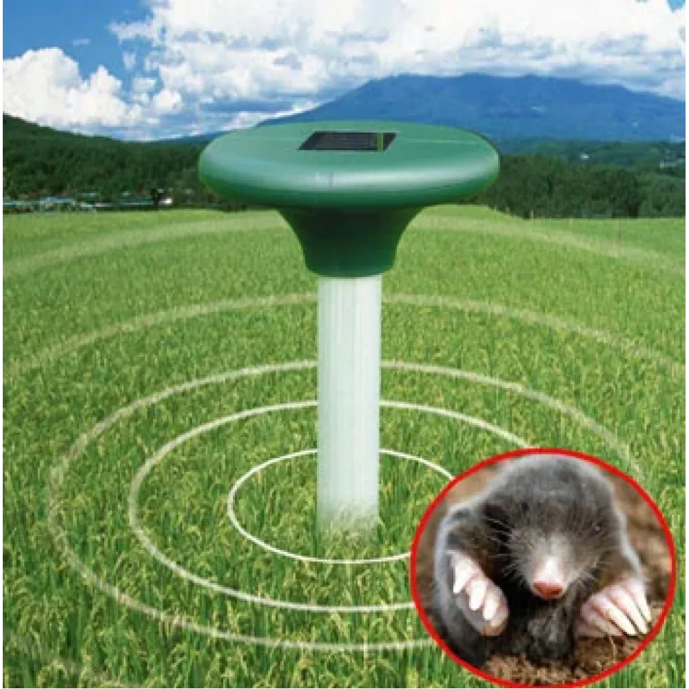 Отпугиватель грызунов и кротов на солнечной батарее издаёт ультразвуковые волны определённой чистоты, которые раздражительно действуют на нервную систему мелких животных и причиняют им страдания. Звуковые колебания излучает металлический стержень прибора. Ультразвуковая волна распространяется через почву в окружности от прибора. Находиться в таких условиях животные не могут и вынуждены покидать территорию вблизи раздражителя. Таким образом, вы надолго избавитесь от: