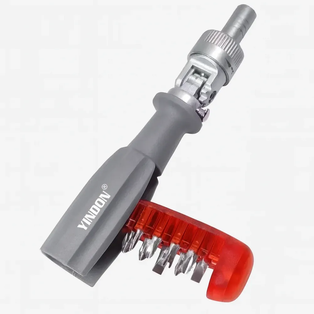 Одной рукой можно менять насадки, экономя время на поиск подходящей головки. Угловая конструкция с регулируемым наклоном до 90° и возможность вращения на 180° делает инструмент удобным даже в ограниченном пространстве. Компактный и легкий набор легко хранить в ящике для инструментов, а противоскользящая эргономичная ручка обеспечивает надежный захват и комфорт во время работы.