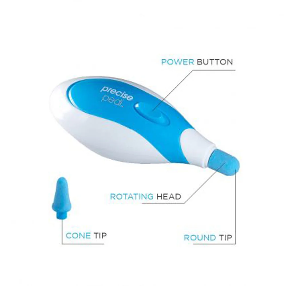 Если вы сталкивались с проблемой сухих, потрескавшихся пяток и натоптышей, то вы наверняка знаете, что порой бывает не так просто от них избавиться. Тогда позвольте представить вам электрическую пемзу Precise Pedi. Это косметическое устройство предназначено для того, чтобы вы могли легко, быстро и просто избавиться от неровностей и превратить ваши ноги в гладкие и ухоженные. С двумя специально разработанными микро-кристаллическими наконечниками (1 круглый и 1 конический) вы очень просто достигнете результата, даже между пальцами ног. Precise Pedi прост в управлении. Благодаря эргономичному дизайну и удобной ручке его комфортно держать в руках. Электрическую пемзу можно использовать на сухой, потрескавшейся и мозолистой коже рук и ног.