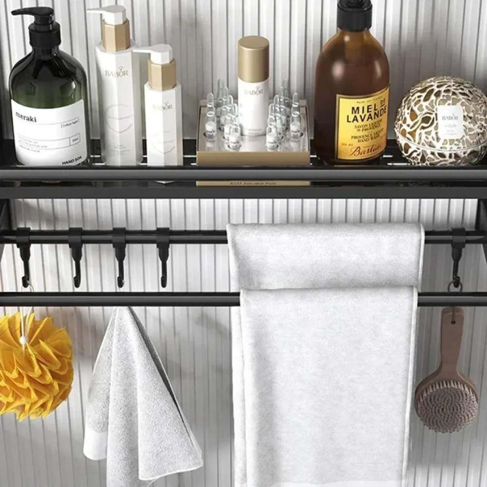 Продуманная конструкция позволяет удобно хранить полотенца, косметику, туалетные принадлежности и другие аксессуары, сохраняя порядок и экономя пространство. Полка оснащена крепкими планками и держателями, что делает размещение предметов максимально безопасным и удобным.