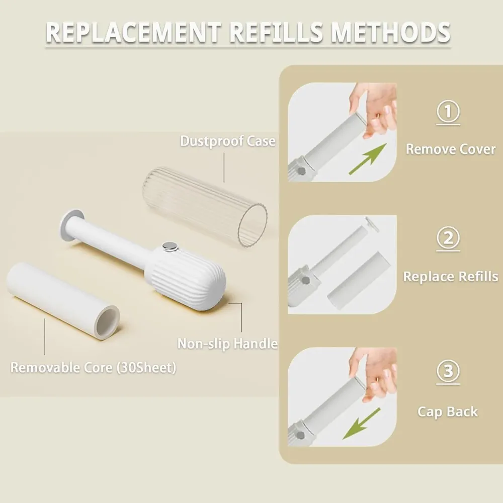 Компактный и удобный липкий ролик предназначен для эффективного удаления шерсти, ворса и пыли с одежды, мебели и других тканей.