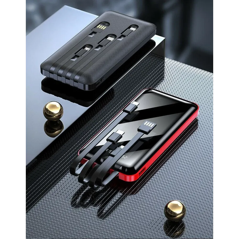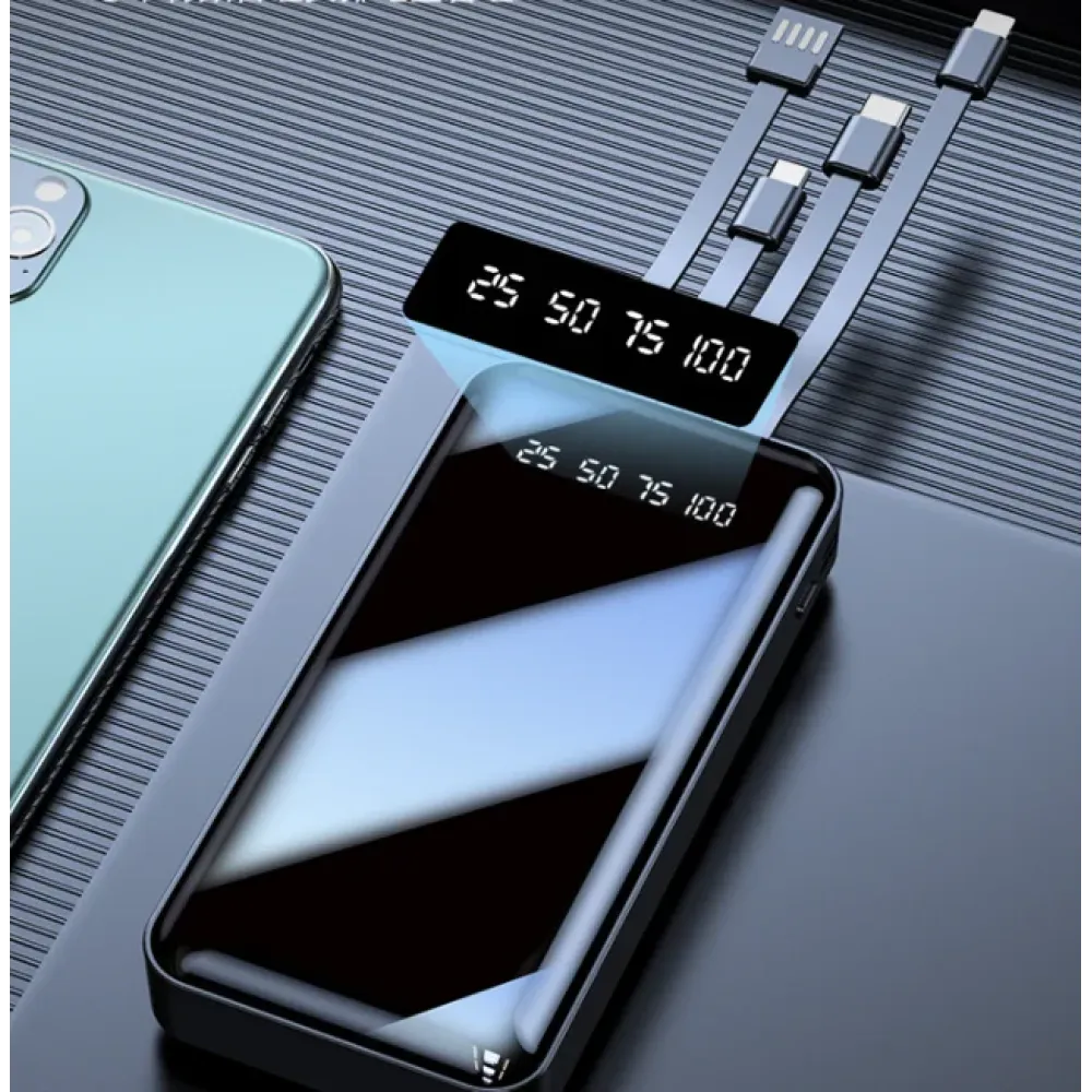 Power Bank 4LINE 20000mAh Внешний портативный аккумулятор с встроенными зарядными кабелями для microUSB ∙ Type-C ∙ USB ∙ iPhone ∙ Павербанк с цифровым зеркальным экраном для всех устройств 4 в 1