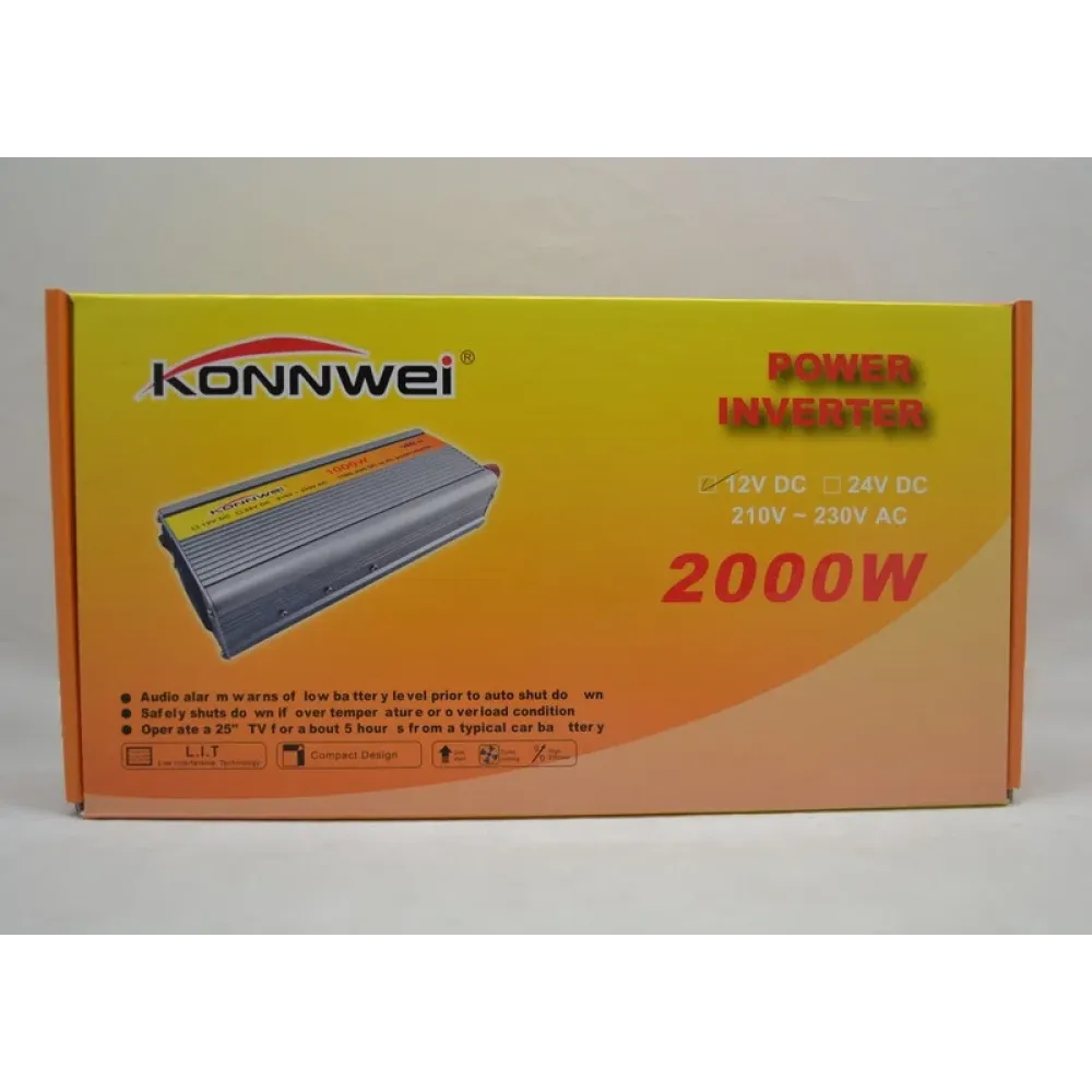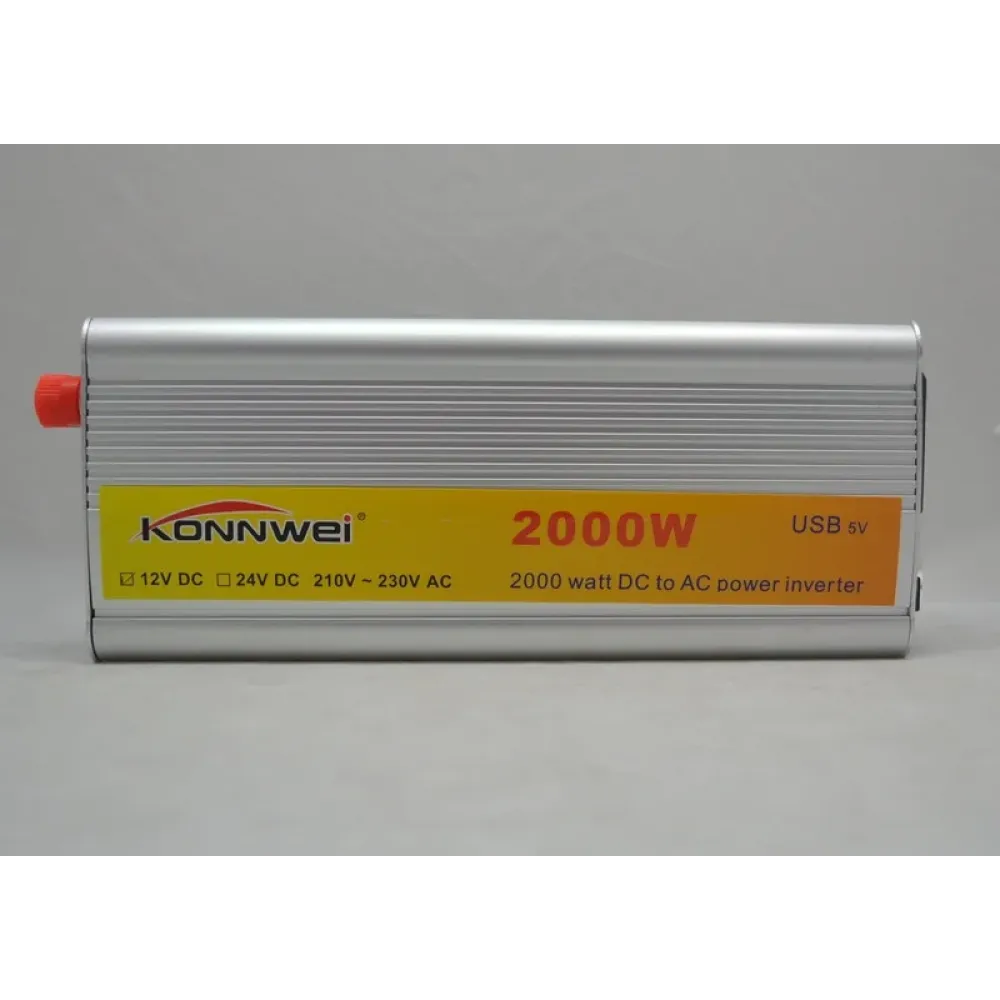 Инвертор мощностью 2 кВт для постройки автономной энергосистемы. Компактный, мощный и простой инвертор Konnwei 2000w поможет построить на основе обычного автомобильного аккумулятора полноценную систему энергоснабжения. Такая система работает автономно в любых условиях. Прибор предназначен для преобразования 12В от АКБ в 220В.
