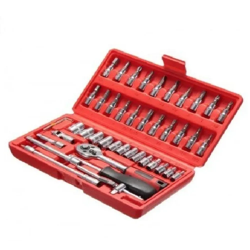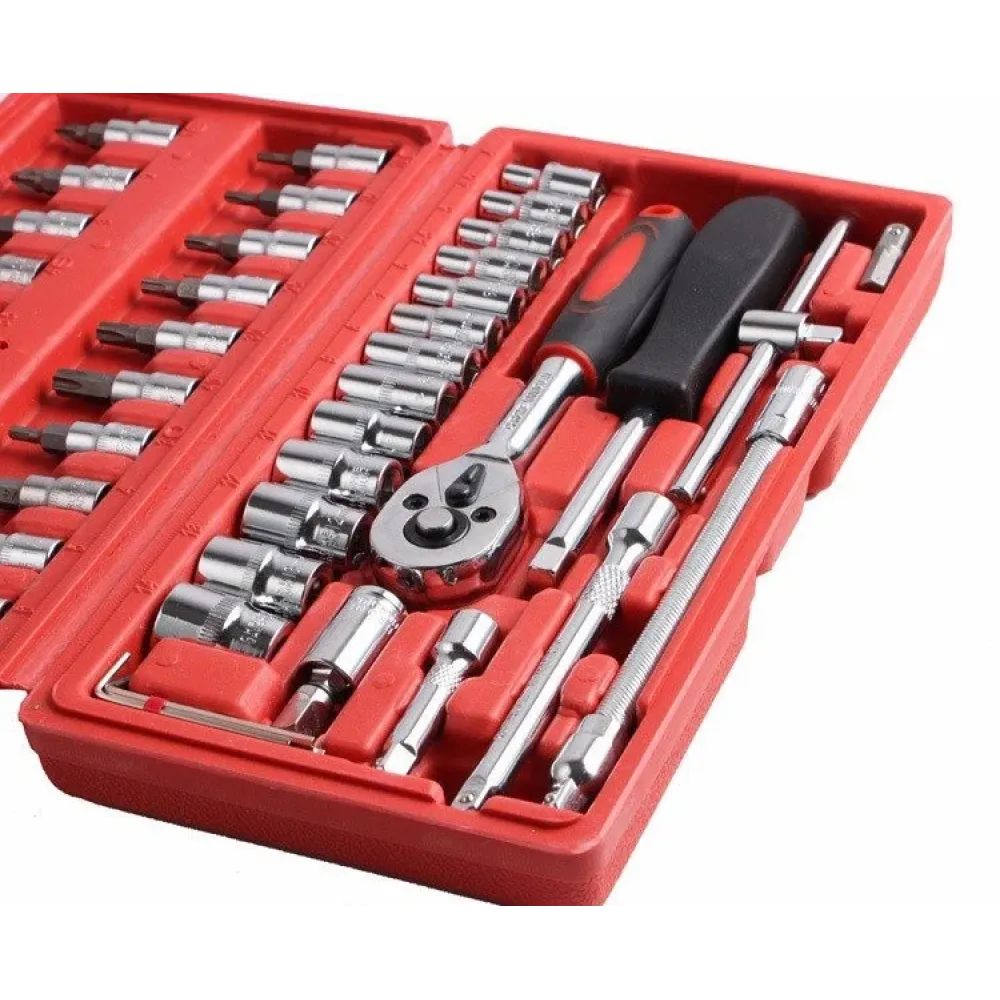 Удобный и компактный набор инструментов 46 элементов сделан из прочной хромированной стали, которая выдерживает небывалые нагрузки. Удобные пластиковые ручки на трещотке и отвертке позволяют инструментом удобно держаться в руке.