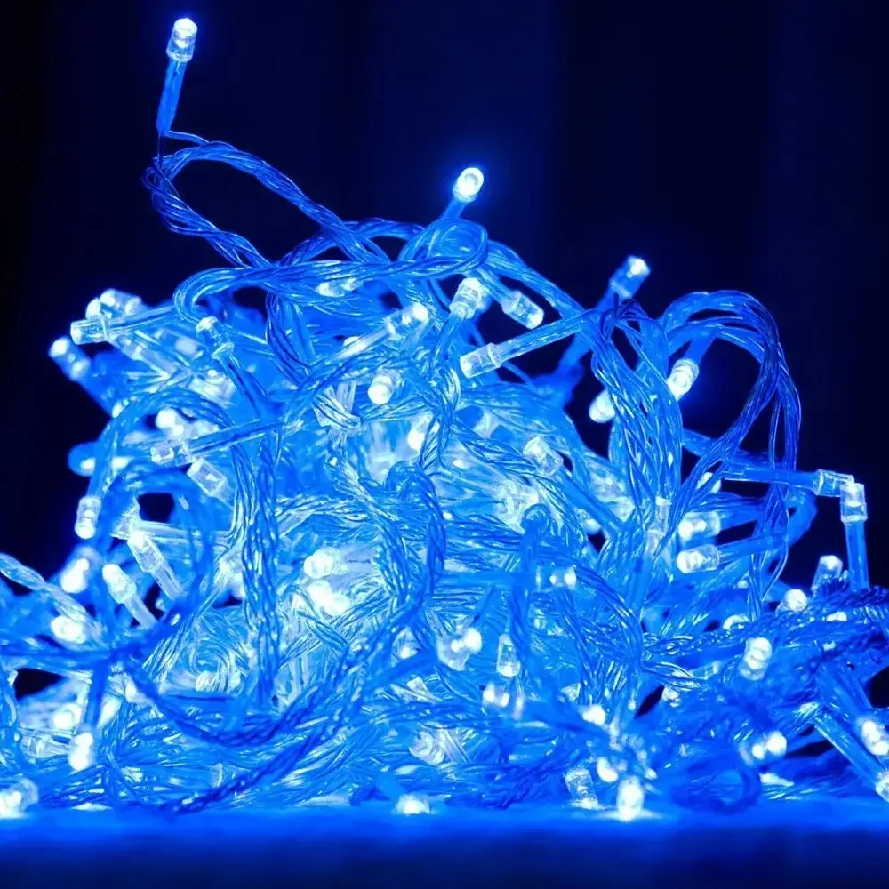Гирлянда с прозрачным проводом и синим светом создаёт яркую и праздничную атмосферу в доме, на балконе или в саду. Она отлично подходит для украшения интерьера на праздники, вечеринки или для повседневного использования.