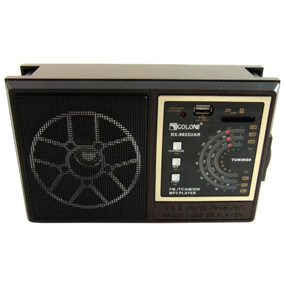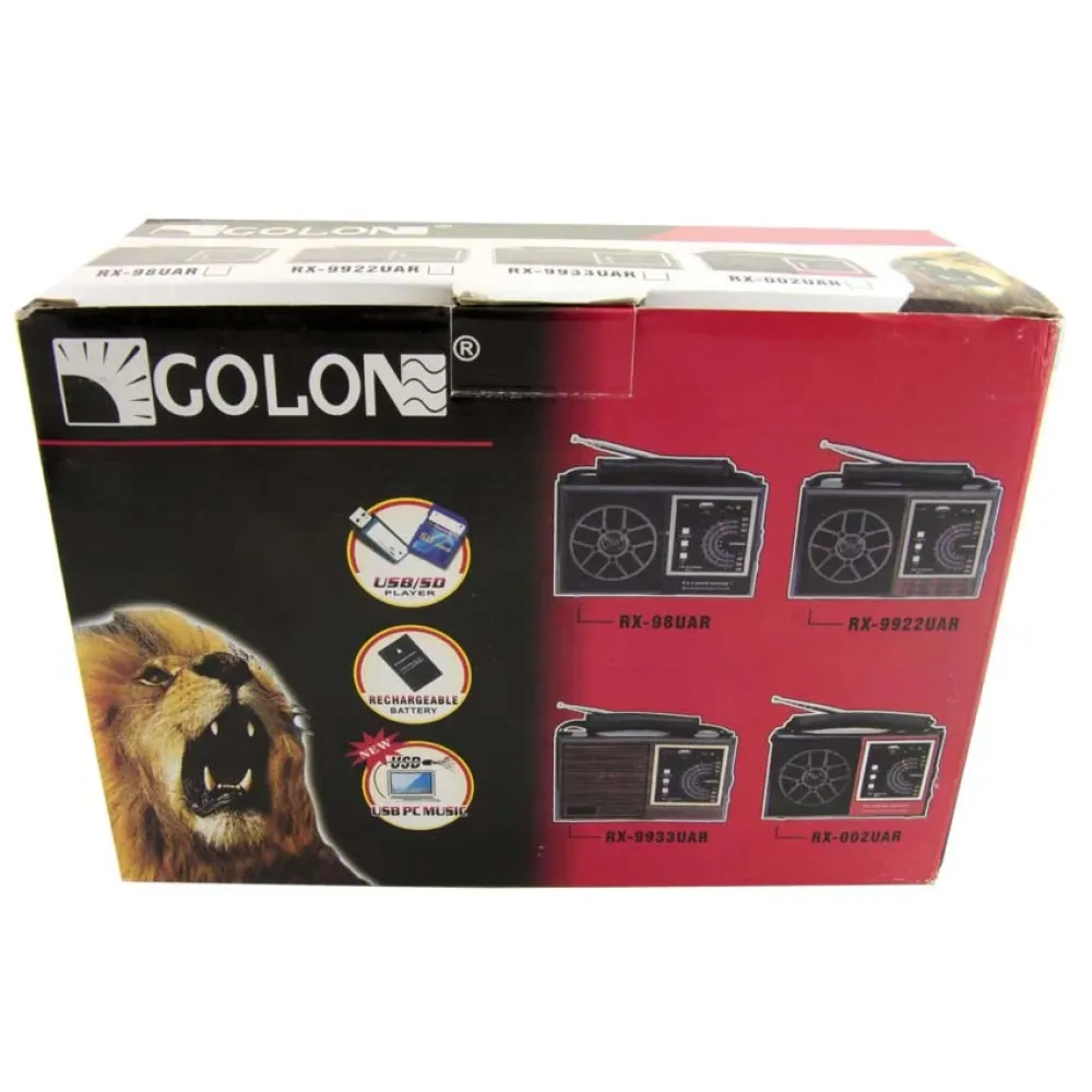 Мультидиапазонний радиоприемник с возможностью воспроизведения MP3/WMA/WAV аудиофайлов с USB флеш-накопителей и SD карт памяти. В Golon RX-9922UAR предусмотрено несколько источников питания: кроме встроенного аккумулятора, это может быть сеть 220 В, или четыре батарейки UM-1. В комплекте поставляется удобный ремешок.