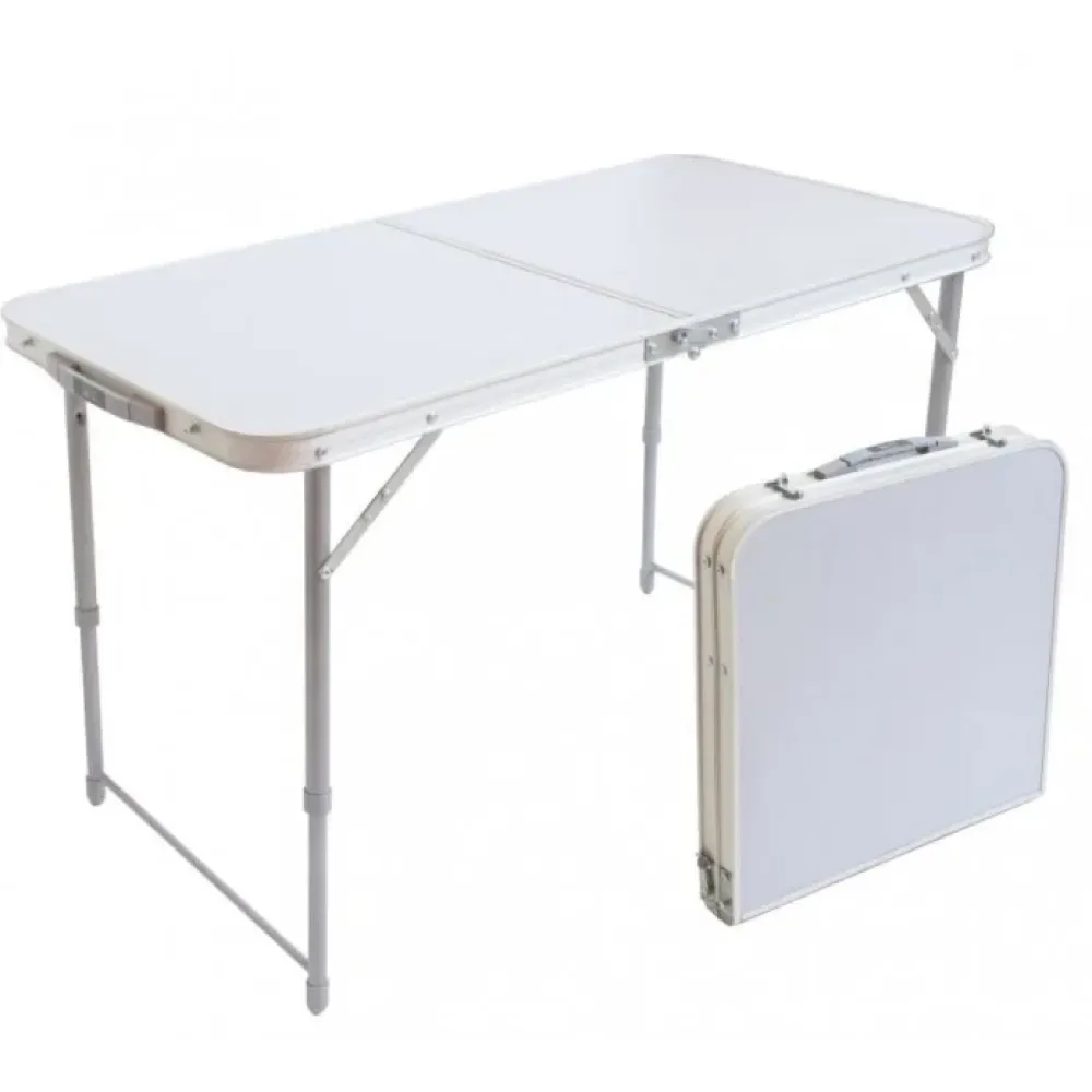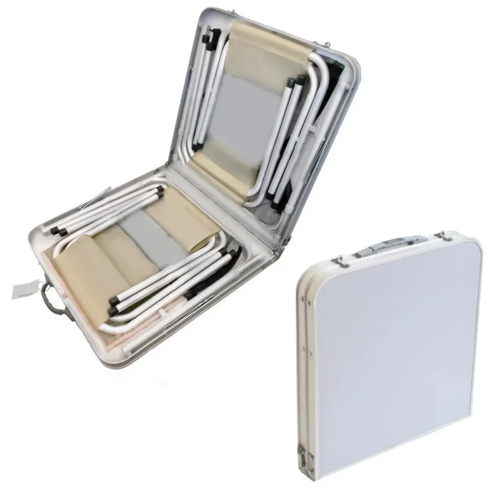 Это очень удобный быстро собирающийся и разбирающийся столик, крышка которого сворачивается в два раза, который в собранном виде имеет форму чемодана. В сложенном виде не занимает много места в багажнике.