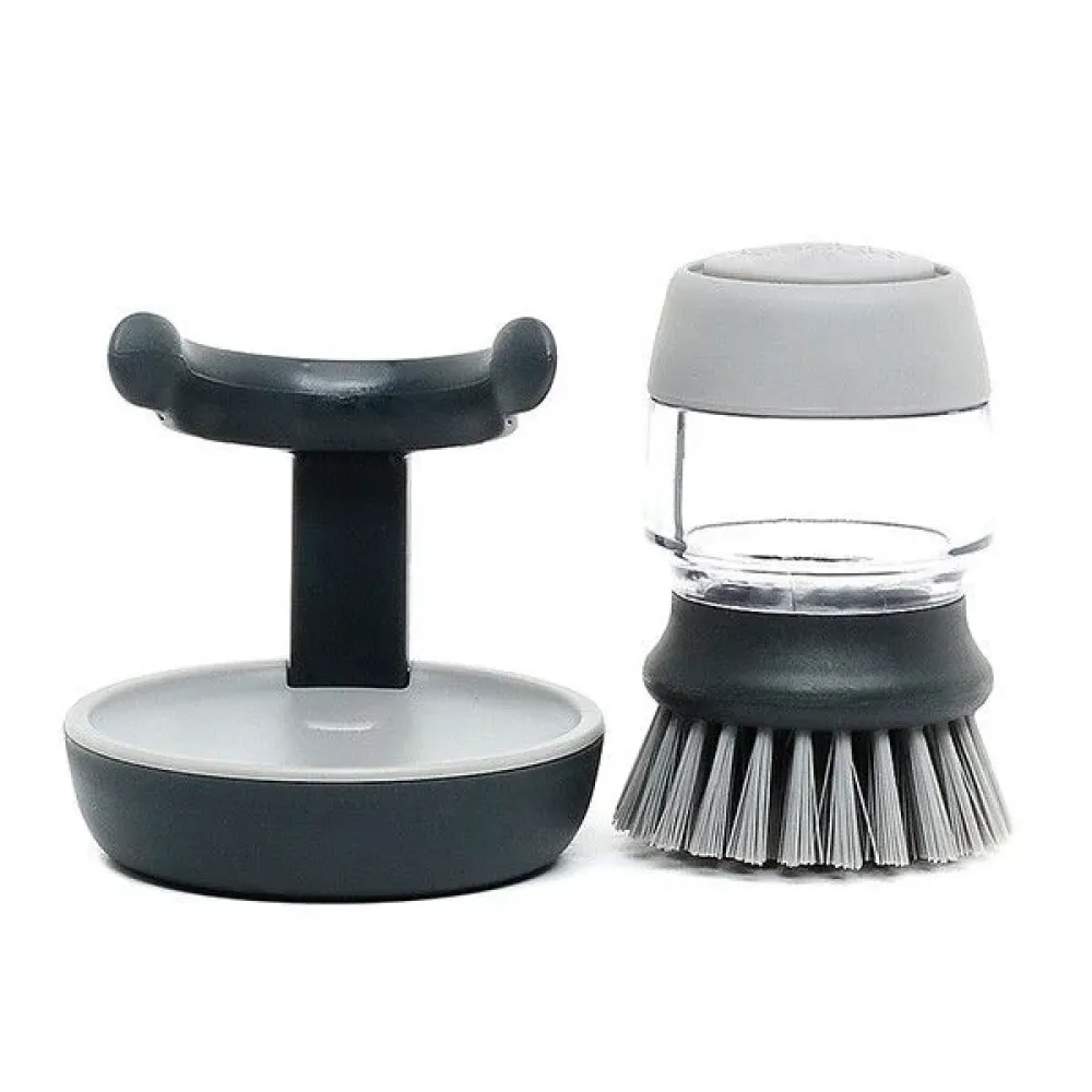 Возле кухонной раковины всегда очень мало места, и всё оно занято бутылочками, губками и прочими моющими аксессуарами. Щетка чистящая универсальная с дозатором моющего средства Joseph Joseph Palm Scrub совмещает в себе практически всё, что нужно для мытья пары десятков тарелок, чашек и сковородок. В резервуар наливается моющее средство, расход которого вы регулируете, просто нажав на кнопку сверху. Щеточка помогает отмыть даже прилипшие остатки пищи и при необходимости легко меняется. У щетки есть специальная подставка, которая организует пространство и заодно позволяет щетинкам высохнуть.
