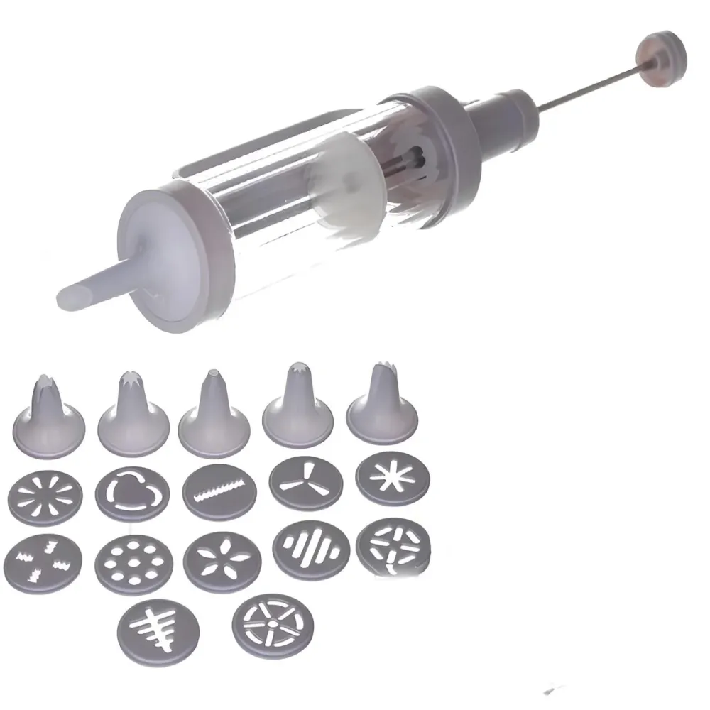 Кондитерский шприц-пресс с насадками предназначен для приготовления печенья, эклеров, а также для декорирования тортов, капкейков и десертов с помощью крема. Это многофункциональный инструмент, который позволяет создавать оригинальные фигуры, узоры и украшения на поверхности выпечки.