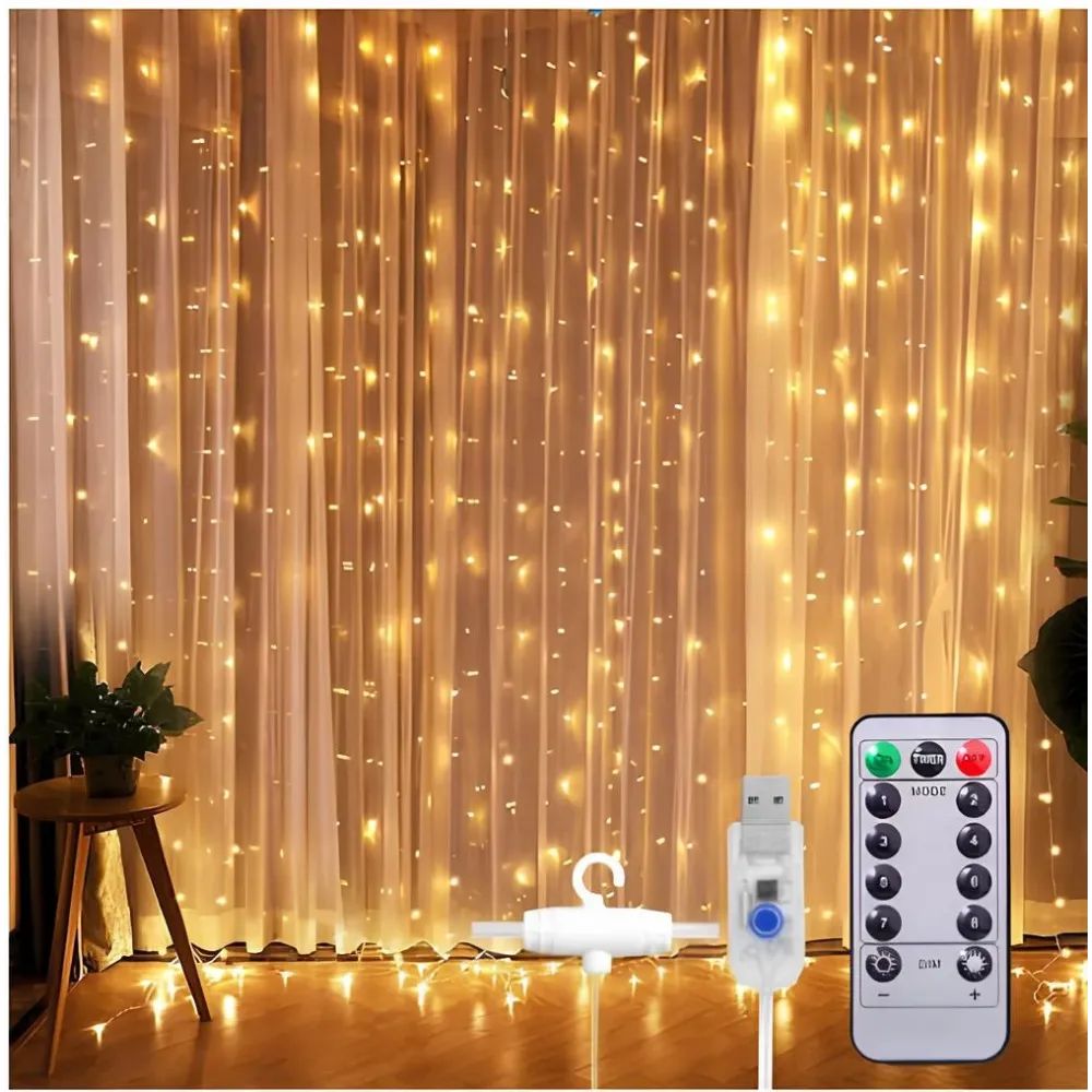 • 8 режимов занавеса света — 3м × 3м (ширина × длина), 300 тёплых белых LED-лампочек