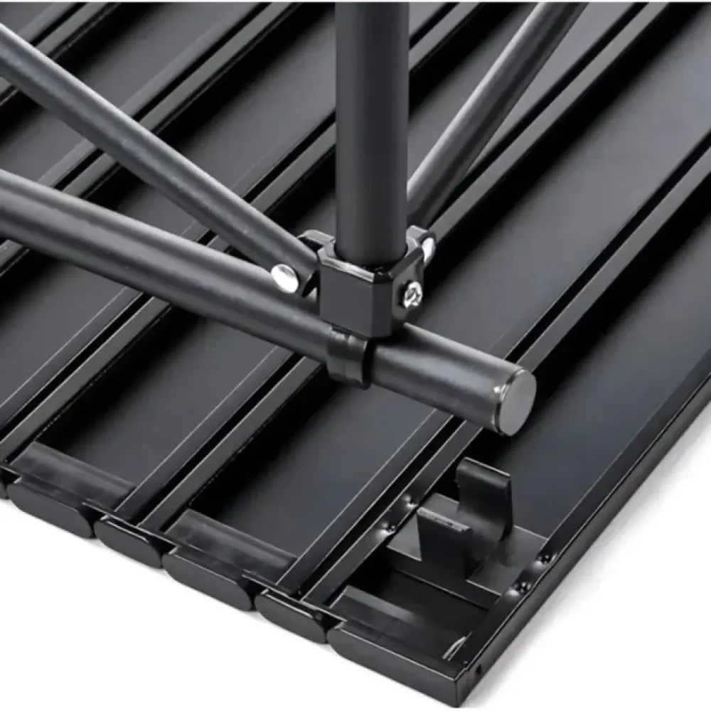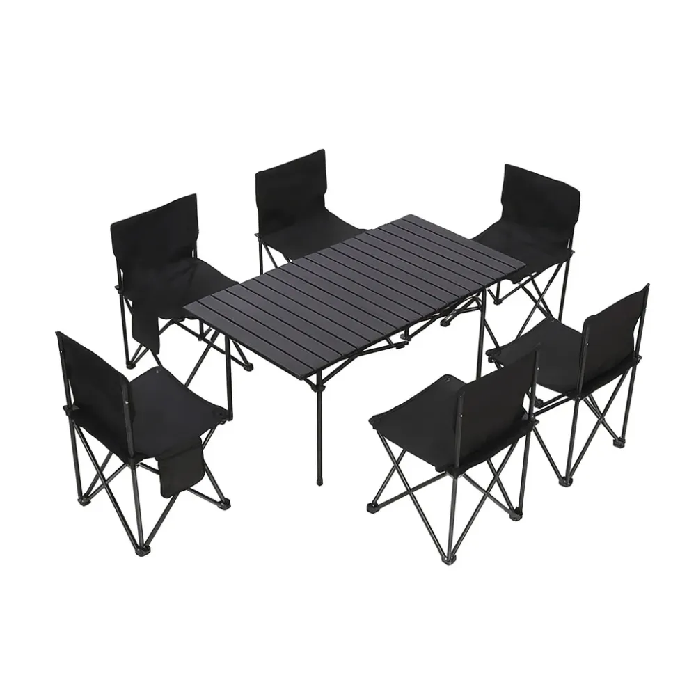Стол размером 95×55 см выполнен из прочных материалов, устойчив к влаге и механическим нагрузкам. Каркас изготовлен из алюминиевого или металлического сплава, что гарантирует надежность и долговечность. Шесть складных стульев из ткани Оксфорд/нейлон с металлическим каркасом выдерживают вес до 100 кг и обеспечивают комфорт даже при длительном сидении