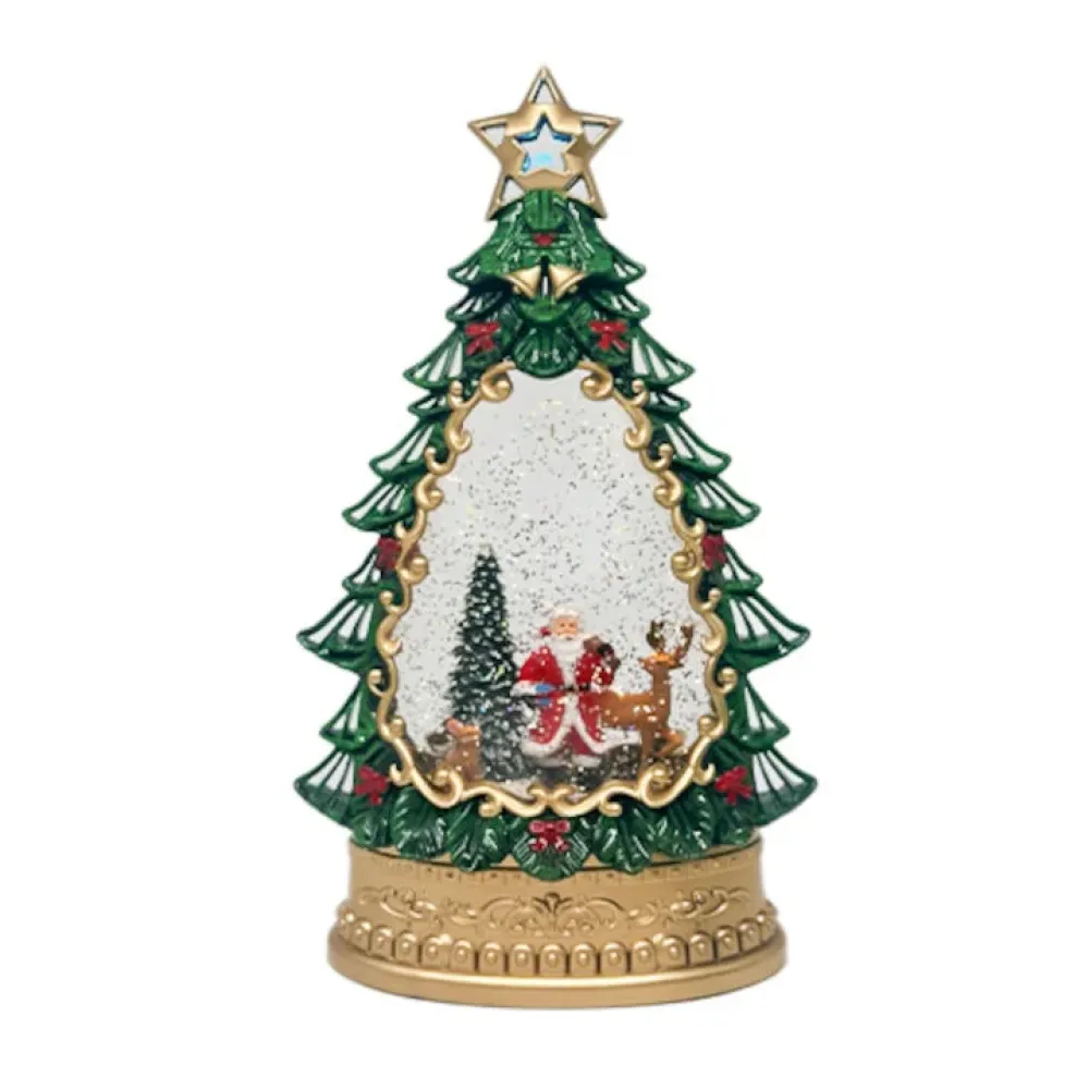 Светильник «Ёлка со снеговиком» — словно окно в волшебную зимнюю страну. Пышная зелёная ёлка с золотой звездой на вершине скрывает внутри настоящую рождественскую сказку: весёлый снеговик с красным шарфом, лесные зверьки и уютный домик, возле которого кружатся снежинки.