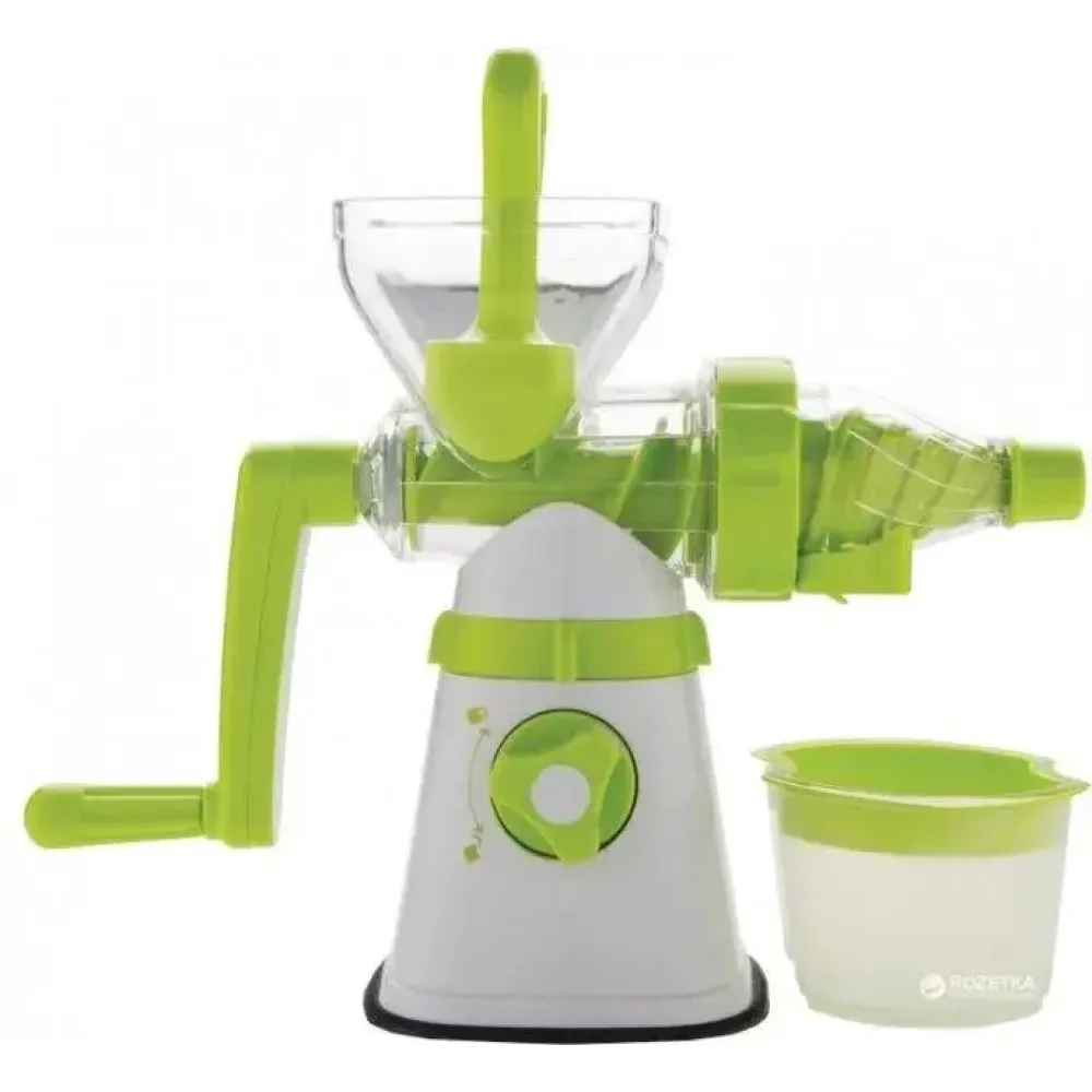 Ручная соковыжималка в обращении похожа на мясорубку, только вместо измельчающих ножей в ней работает шнековый механизм, отделяющий сок фруктов и овощей от мякоти. Прибор с ручным приводом легок и прочен, дарит независимость от внешнего источника электроэнергии и может использоваться даже на природе, например, на даче во время заготовки урожая. Так же очень удобно крепление к столу вакуумной присоской.