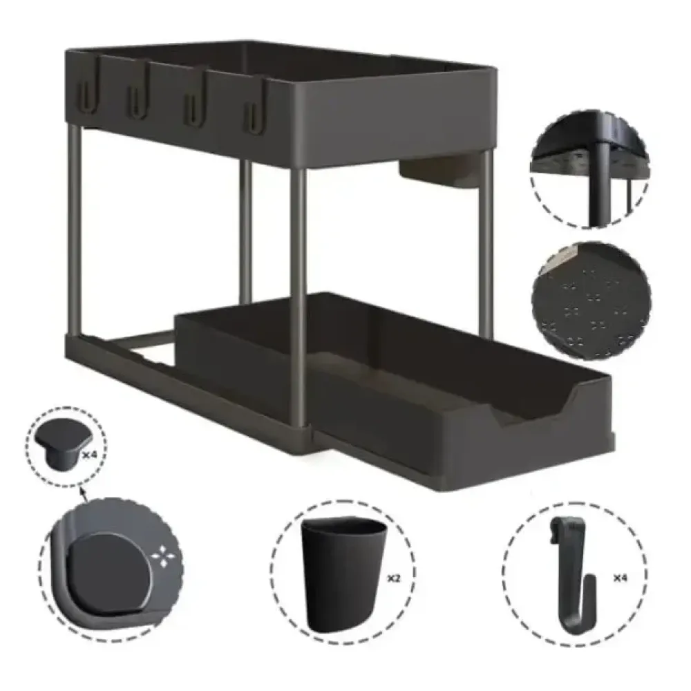 Металлический каркас с пластиковыми элементами гарантирует прочность и устойчивость конструкции, а современный дизайн позволяет органайзеру гармонично вписаться в любой интерьер кухни. Легкая сборка и уход делают стеллаж удобным и долговечным решением для хранения.