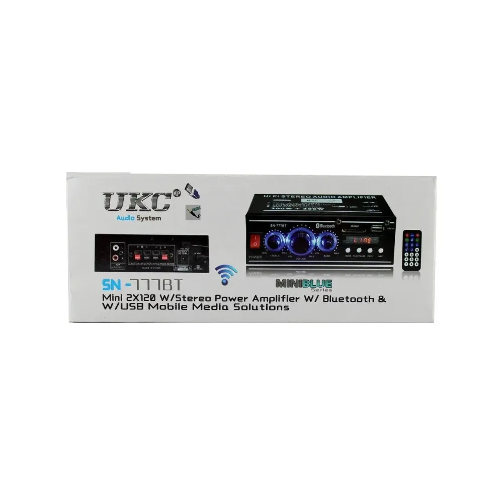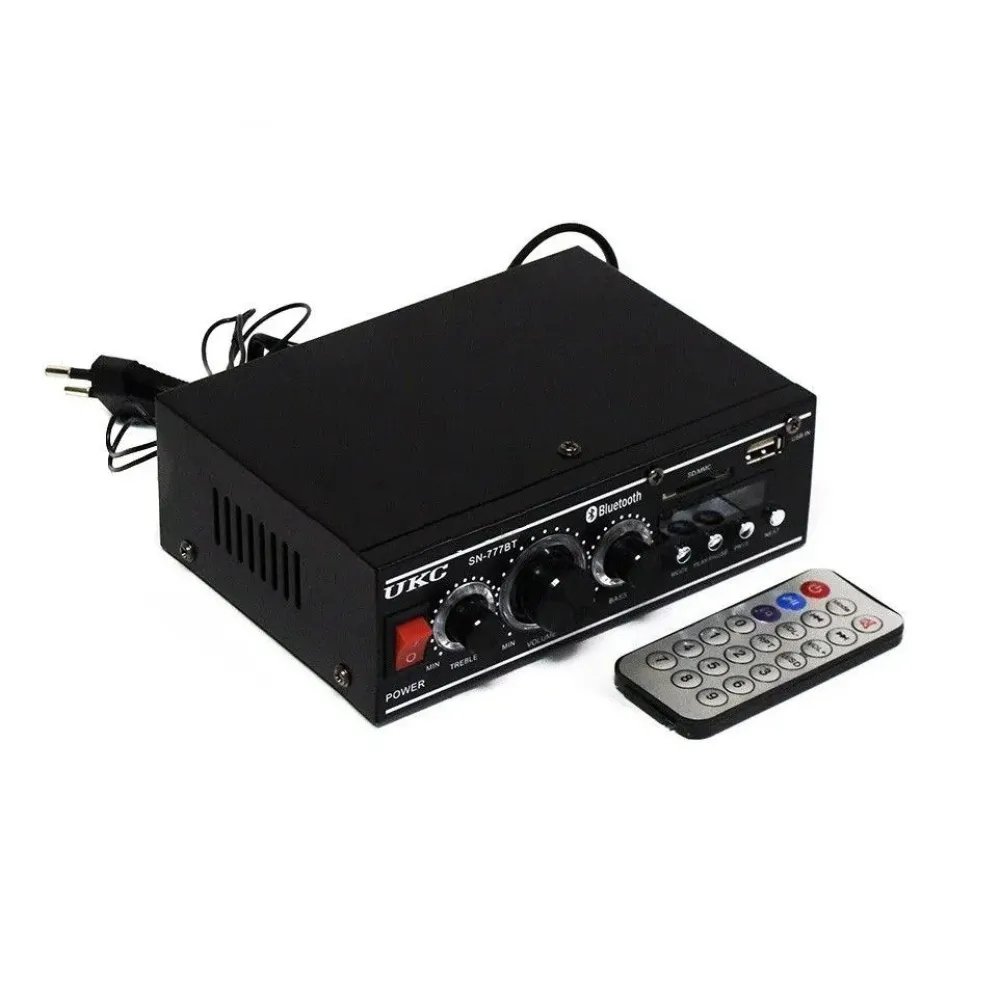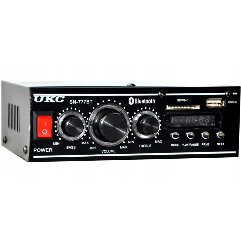 Стерео усилитель UKC SN-777BT Bluetooth – интегральный усилитель со встроенным медиаплеером и FM тюнером, с поддержкой USB флешек и карт памяти SD и с Bluetooth. UKC SN-777BT работает от сети 220V или от адаптера 12V 5A, в комплекте есть пульт ДУ. Усилитель обеспечивает выходную мощность по 25 Вт на каждый из каналов, при равномерной частотной характеристике в диапазоне 20 Гц – 20 000 Гц.