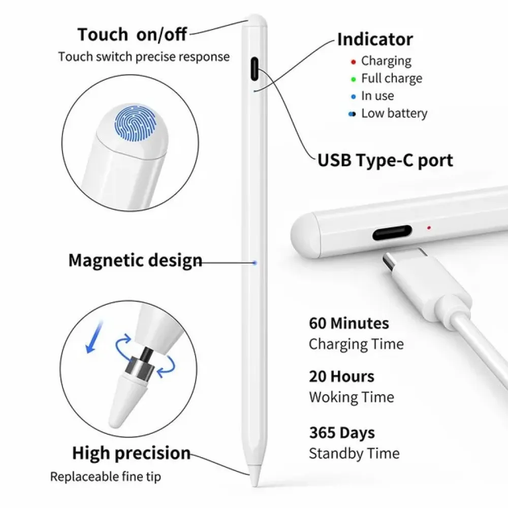 Универсальный стилус Jb09 для планшетов и телефонов — это идеальный аксессуар для точного и комфортного взаимодействия с сенсорными экранами. Благодаря тонкому наконечнику диаметром 1,5 мм, он обеспечивает невероятную точность при касании, что особенно важно при рисовании или работе с мелкими элементами интерфейса. Корпус стилуса изготовлен из прочного металла, что гарантирует долговечность и приятные тактильные ощущения при использовании. Стилус оснащен LED индикатором, который позволяет быстро определить состояние устройства. Он легко активируется двойным нажатием на сенсорную кнопку, что исключает необходимость в дополнительных устройствах или подключениях по Bluetooth.