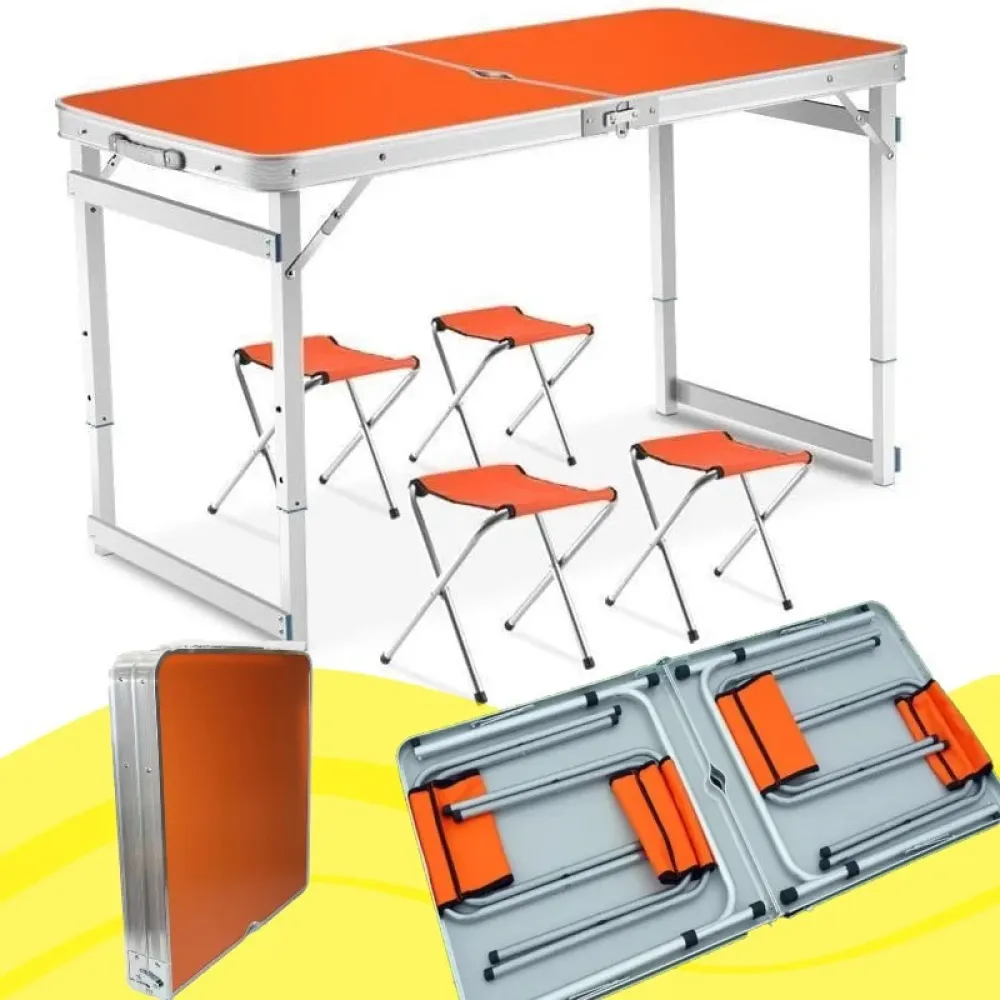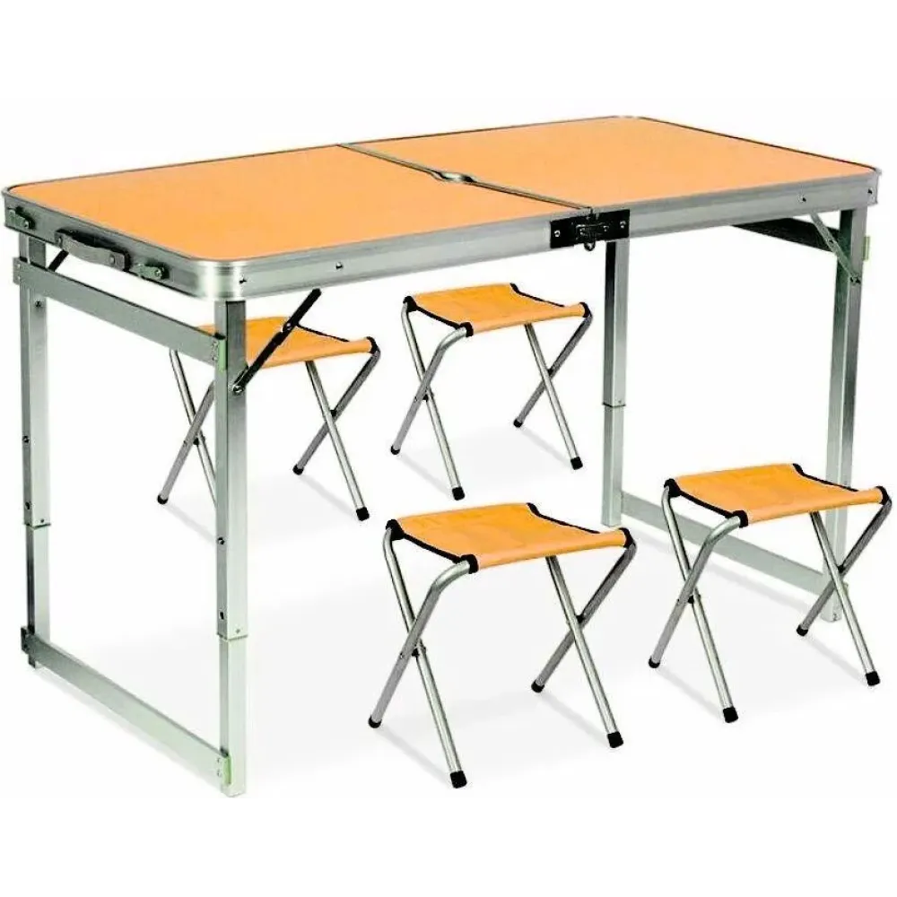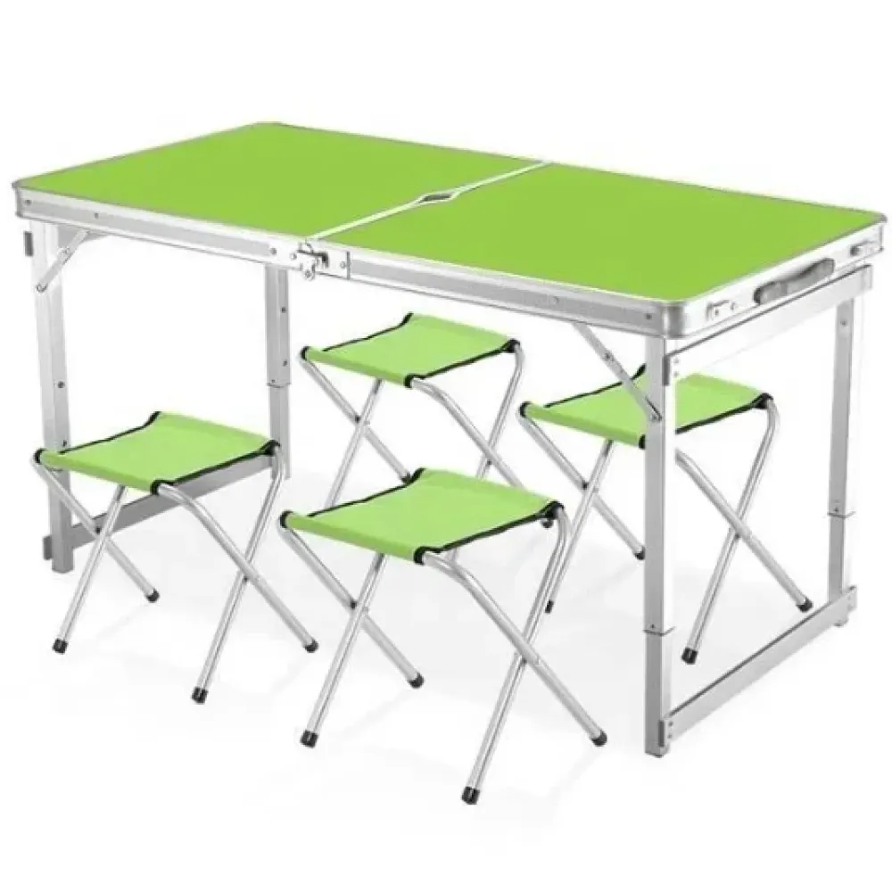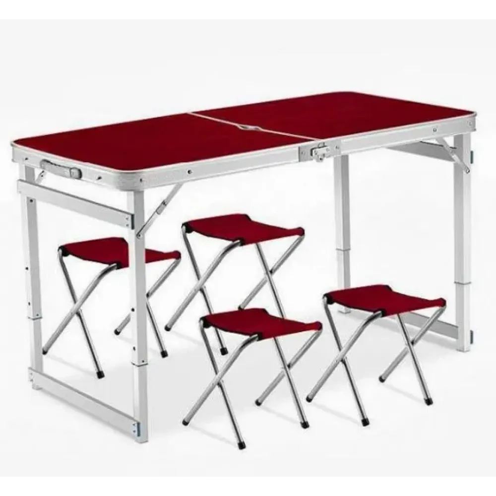 Стол алюминиевый Усиленный с 4 стульями складной для пикника · Стол – чемодан раскладной туристический со стульями ― это одна из тех вещей, которая необходима для поездок на пикник. У стола - утолщённый алюминиевый каркас, столешница МДФ. Четыре стульчика с тканевыми сиденьями. Он очень легко разбирается и моется. Максимальная нагрузка на стол: 40 кг. Особенностью данного раскладного стола являются выдвижные ножки, которые фиксируются специальными кнопками-защёлками. При выдвижении ножек стол имеет высоту 70 см.