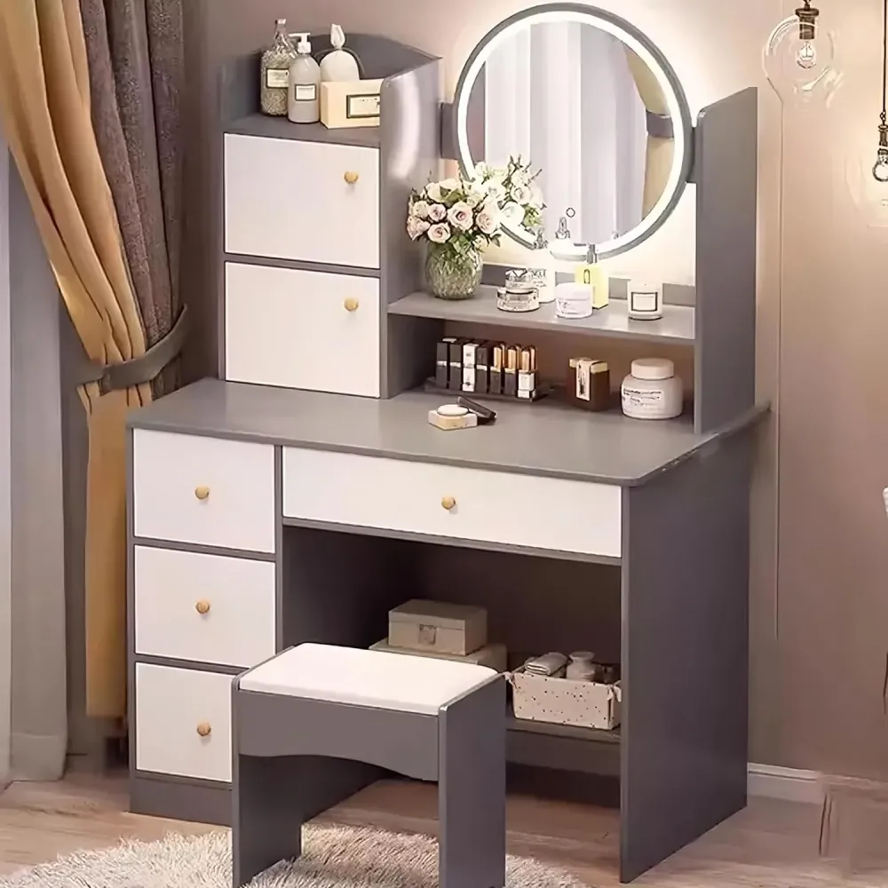 Стол макияжный с LED-зеркалом STL-MD 72 (Г40/Ш80/В127) • Серо-белый туалетный столик с подсветкой и ящиками