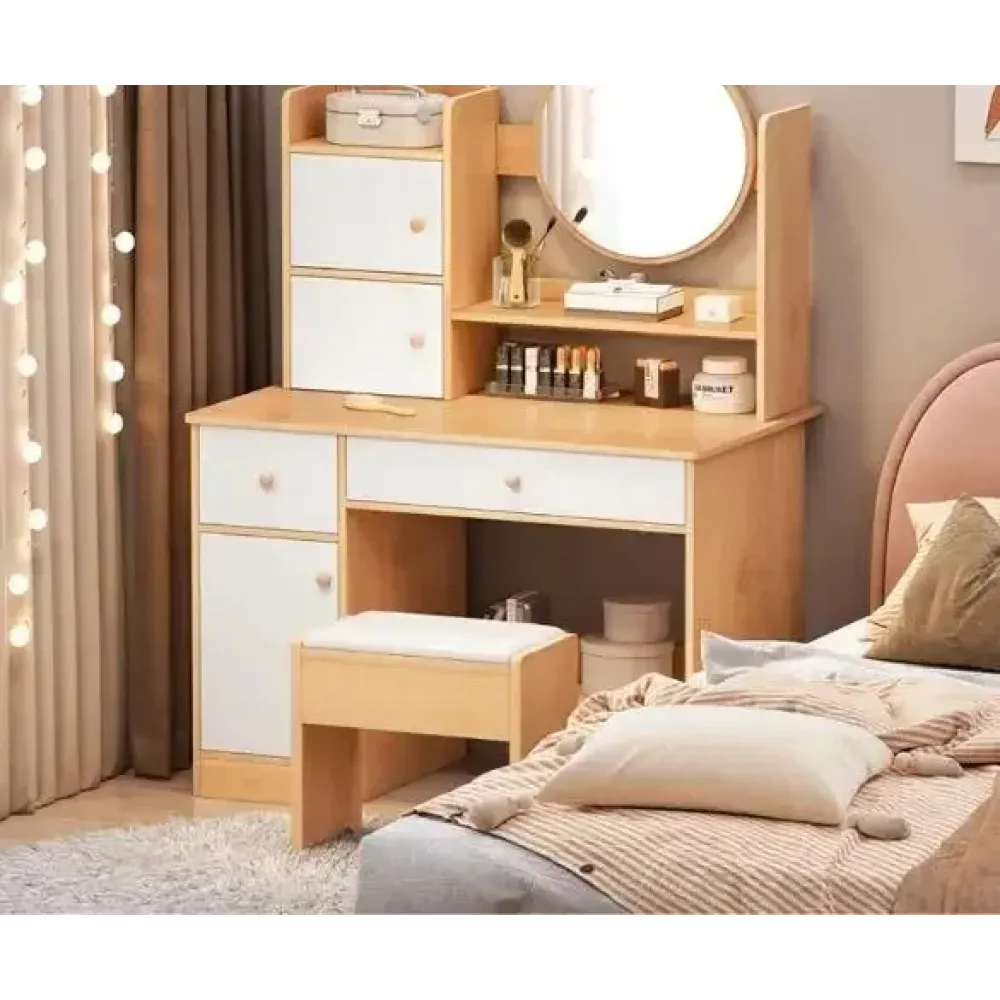Компактные размеры (глубина — 40 см, ширина — 80 см, высота — 127 см) позволяют разместить стол даже в небольших помещениях, при этом он остаётся максимально практичным. Удобные выдвижные ящики и полки позволяют аккуратно хранить косметику, аксессуары и украшения, чтобы всё было под рукой. Прочные материалы и качественная фурнитура гарантируют долговечность конструкции, а продуманная эргономика делает использование столика комфортным каждый день.