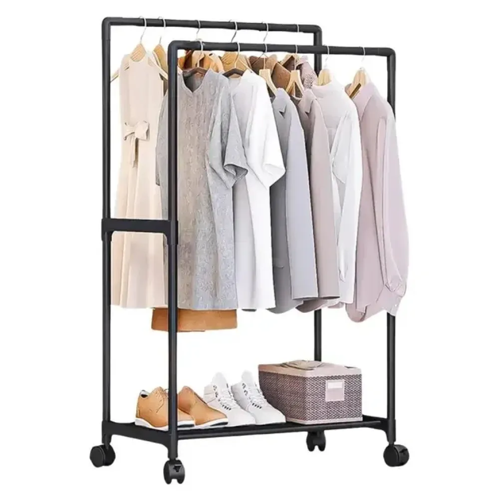 Стойка-вешалка на колёсах YH9918-1 — это удобное и практичное решение для организации пространства в доме, офисе или магазине. Благодаря двойной конструкции со штангами, она позволяет разместить больше одежды, а нижняя полка идеально подходит для обуви, сумок и аксессуаров.