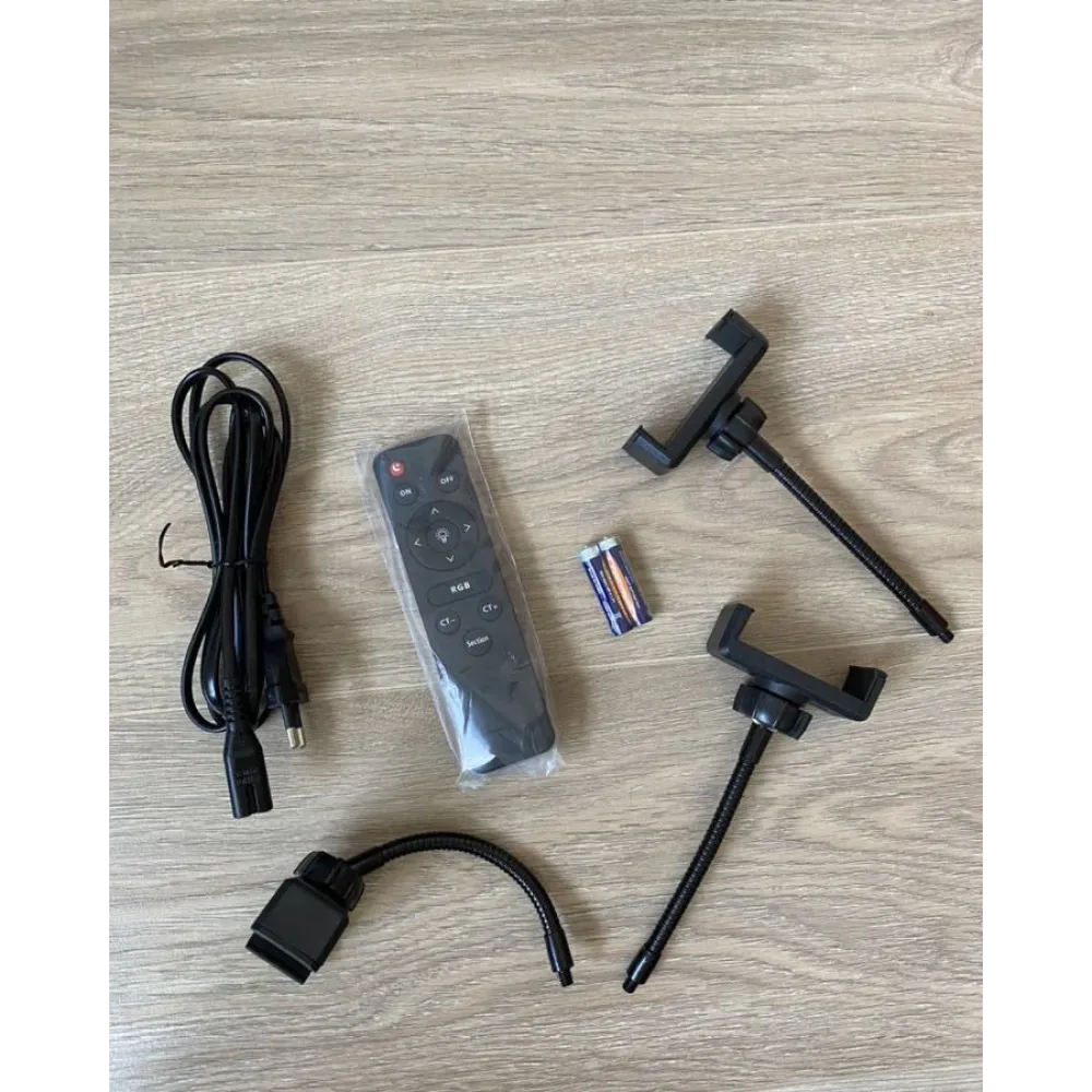 Лампа оснащена надёжными 3-мя фиксаторами для камеры или смартфона. Его можно регулировать по ширине, менять наклон и повороты гибкой ножки-держателя.