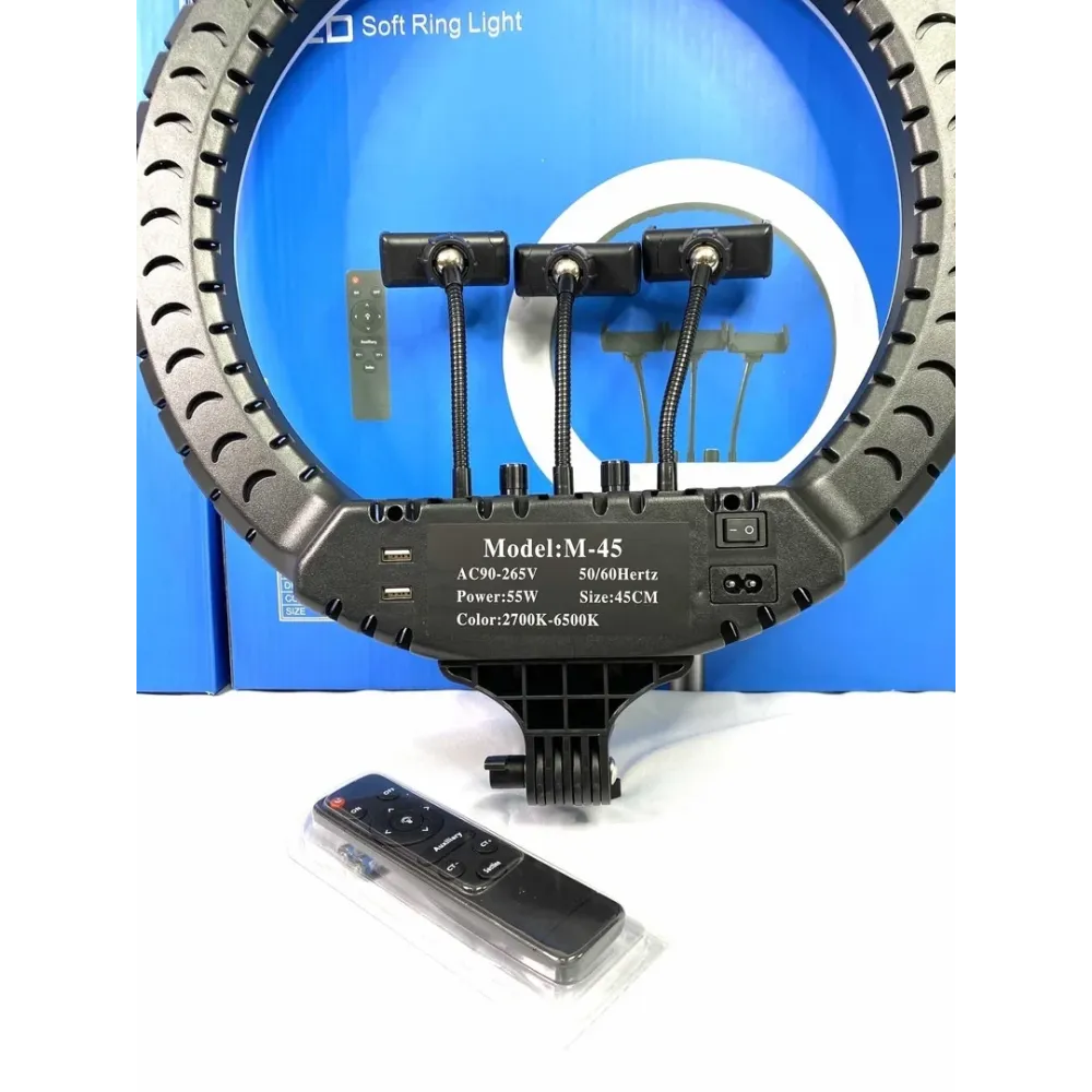 Кольцевая светодиодная лампа LED Soft Ring Light RL-18 имеет 512 SMD светодиодов, которые обеспечивают равномерный свет, без мерцания. Лампа подключается к сети 220V и не нагревается даже после долгого периода работы. Плавная регулировка температуры и яркости света осуществляется двумя диммерами, находящимися на корпусе кольцевого осветителя.