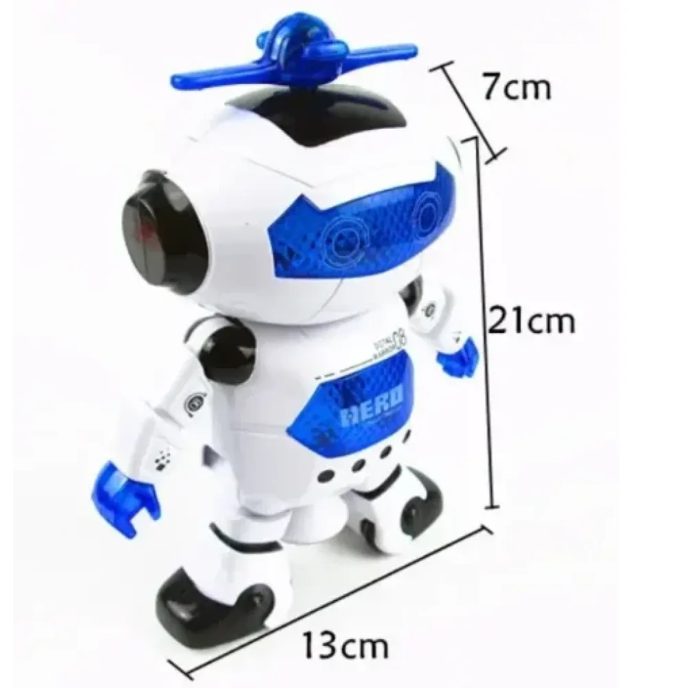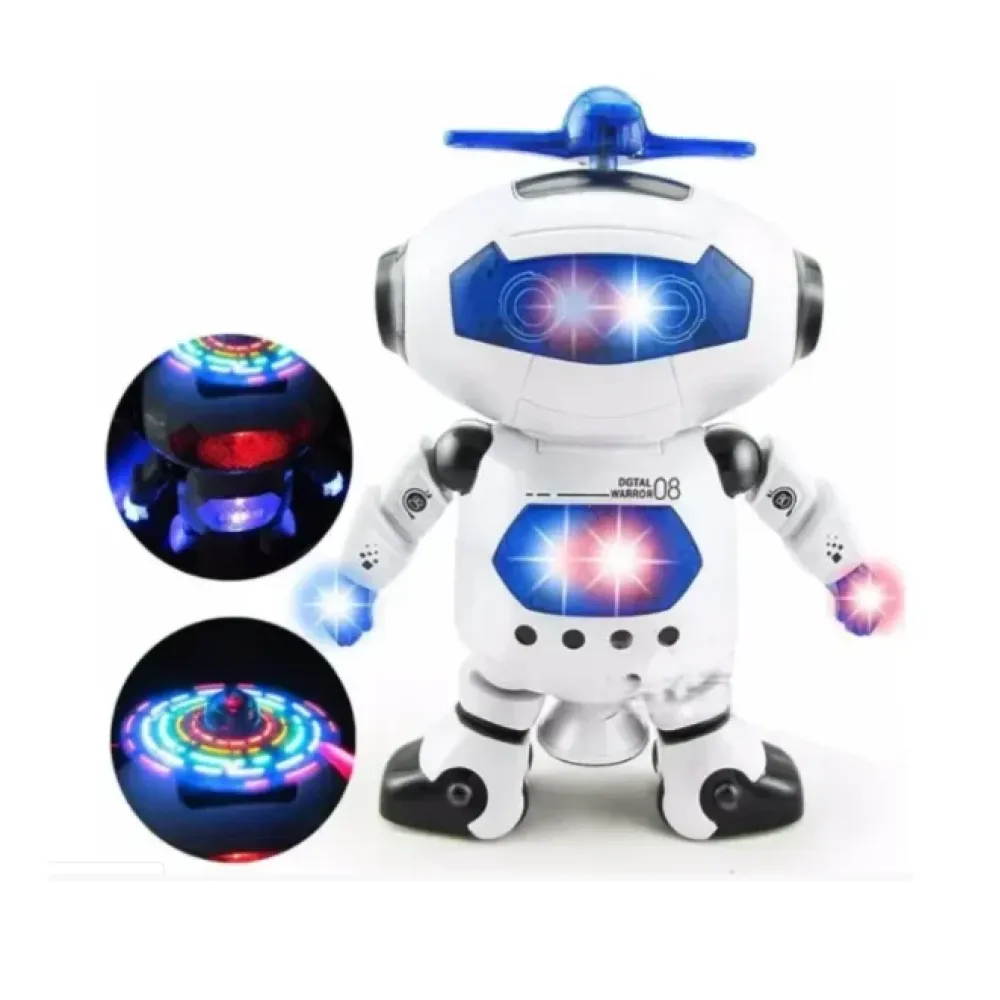 Электронный светящийся робот вращается на 360 градусов. Под забавную музыку начинает при ходьбе плавно скользить по кругу, одновременно вращаясь вокруг своей оси, двигая ручками и приседая.