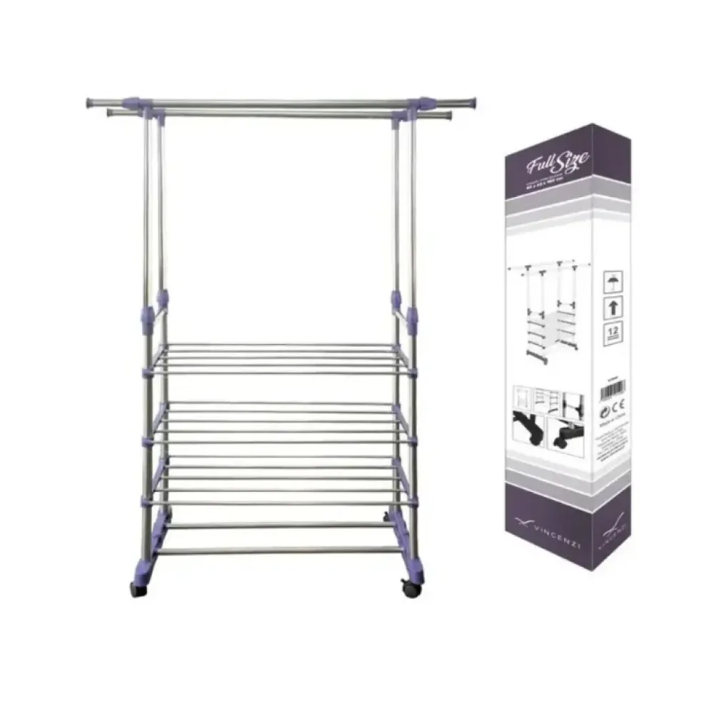 Стойка также имеет 4 больших полки для одежды, обуви или других вещей.Вешалка изготовлена из прочных стальных и хромированных труб. Она имеет регулировку по высоте от 95 до 165 см, а наличие колесиков позволяет легко транспортировать стойку.