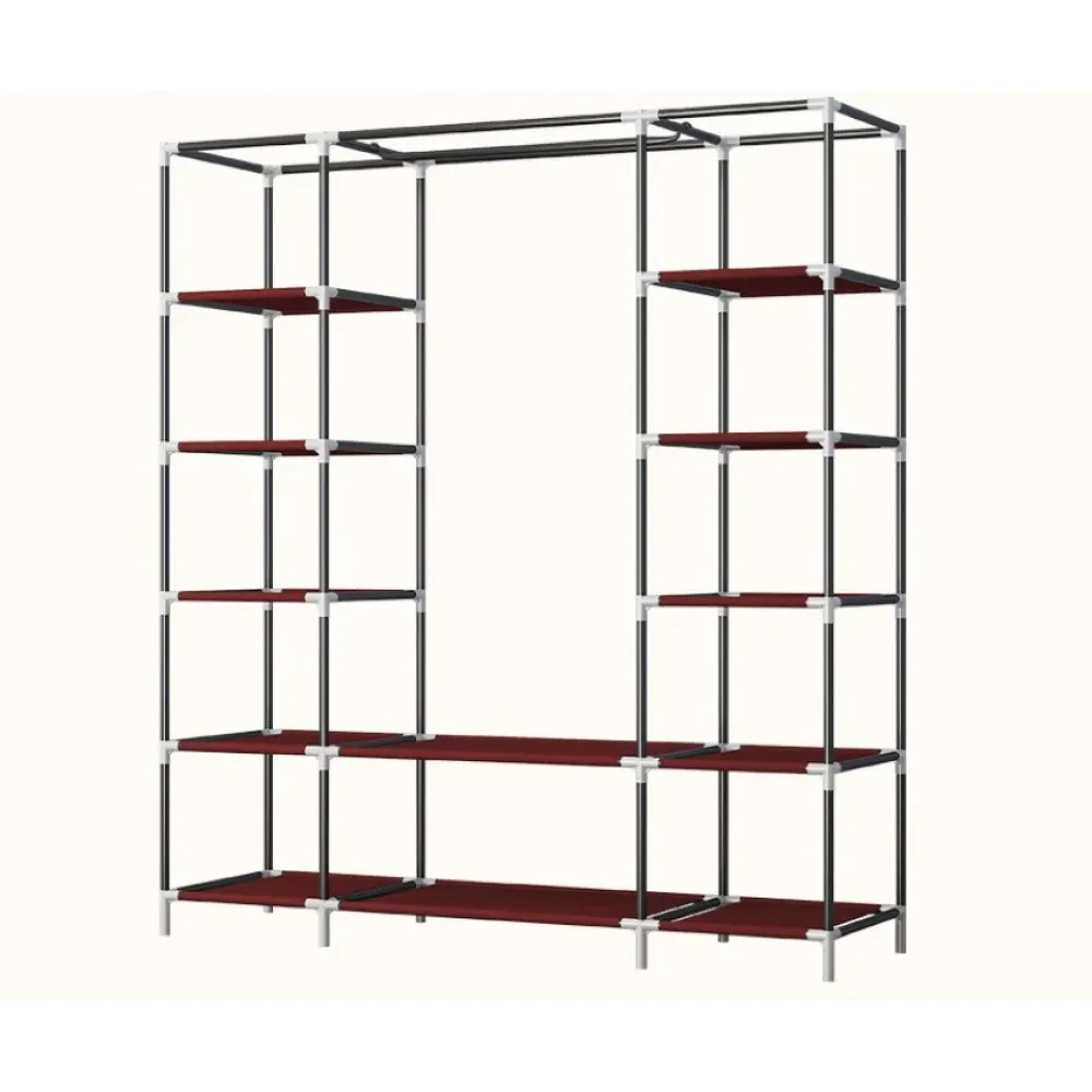 Конструкция шкафа включает стальной каркас, который обеспечивает прочность, и плотный тканевый чехол, защищающий вещи от пыли и влаги. Благодаря 12 полкам и рейке для вешалок, вы сможете разместить одежду максимально удобно.