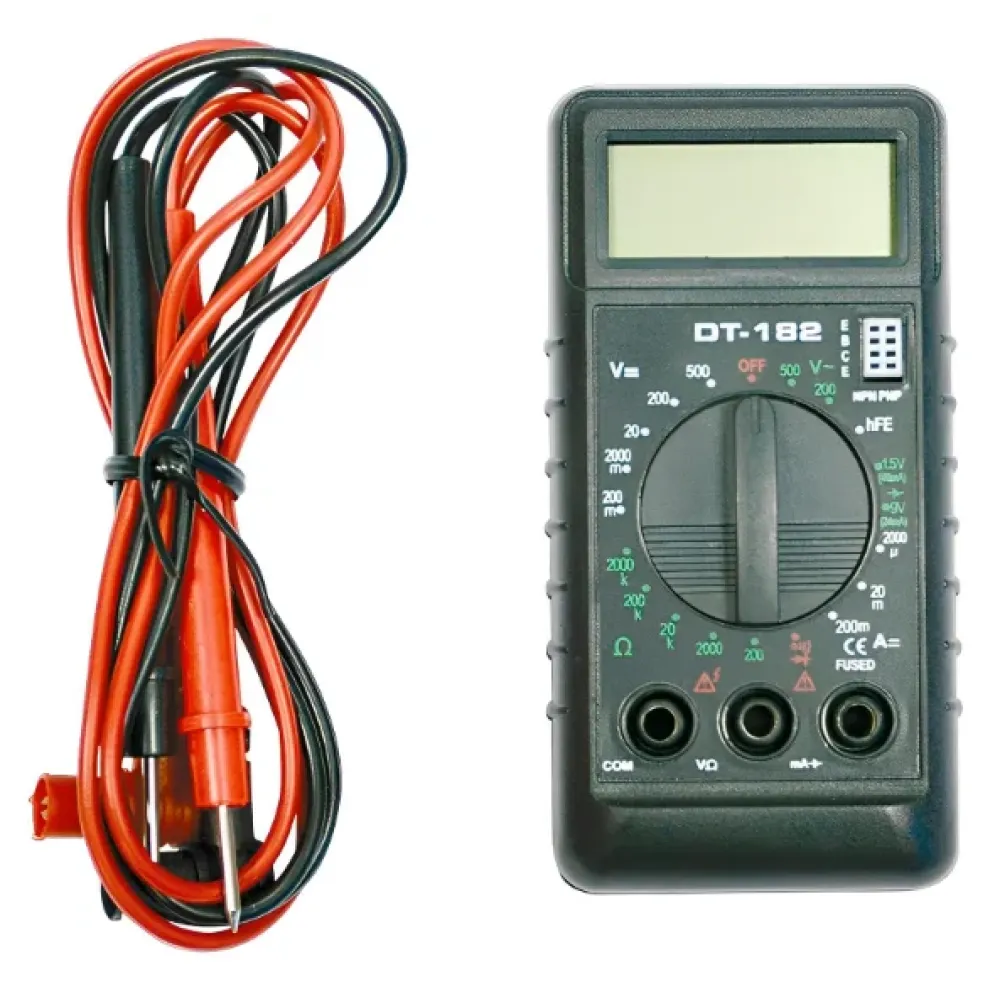 Мультиметр DT-182 – является универсальным прибором, который необходим в каждом хозяйстве. Поможет отыскать аварийные участки в электропроводке в квартире или доме. Цифровой мультиметр DT-182 представляет собой компактный вариант тестера, предназначенный для работ по измерению напряжения, сопротивления, силы тока. Помимо основных функций он может помочь в тестировании диодов и транзисторов, в прозвонке соединений и тесте батареек.