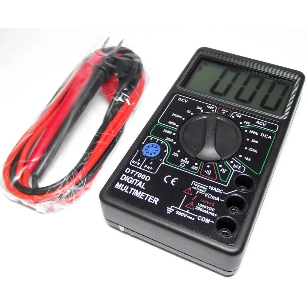 Мультиметр DT700D измеряет целостность электроцепи, подавая звуковой сигнал при проверке соединения. Преимущества мультиметра этой модели: • небольшие размеры для ношения в спецодежде; • оптимальная цена для универсального измерителя; • проверка коэффициента роста тока с помощью транзистора; • тестирование работы диодов. Мультиметр работает с электрическими цепями или устройствами для переменного и постоянного тока, определяя их важнейшие свойства: • напряжение в пределе до 500 В; • силу подаваемого электротока до 5 А; • сопротивление до 2Мом. Для щупов предназначено три входа. Комбинирование входов позволяет получить необходимые показатели, в том числе по измерению силы тока и высокого напряжения, проверки на короткое замыкание. Для работы с электроникой необходима будет функция генерирования сигналов прямоугольной формы с частотой 50 Гц. Комплектация устройства состоит из прибора, электрощупов, батарейки для питания монитора и электронной части устройства. Общий вес устройства не более 150 грамм. Размеры устройства минимальны: 12,6x7x2,4см. Они позволяют переносить устройство в сумке с инструментами или в карманах спецодежды.