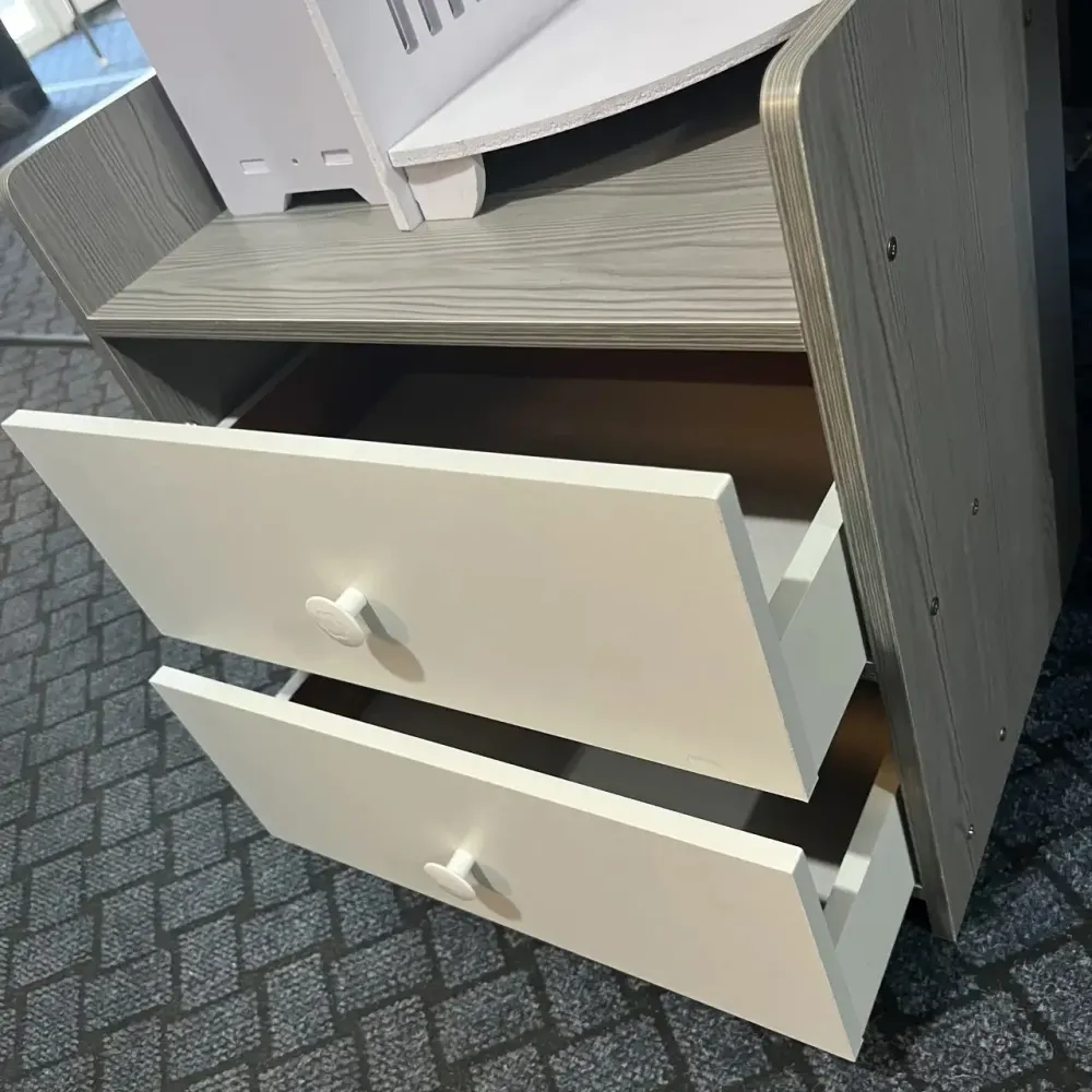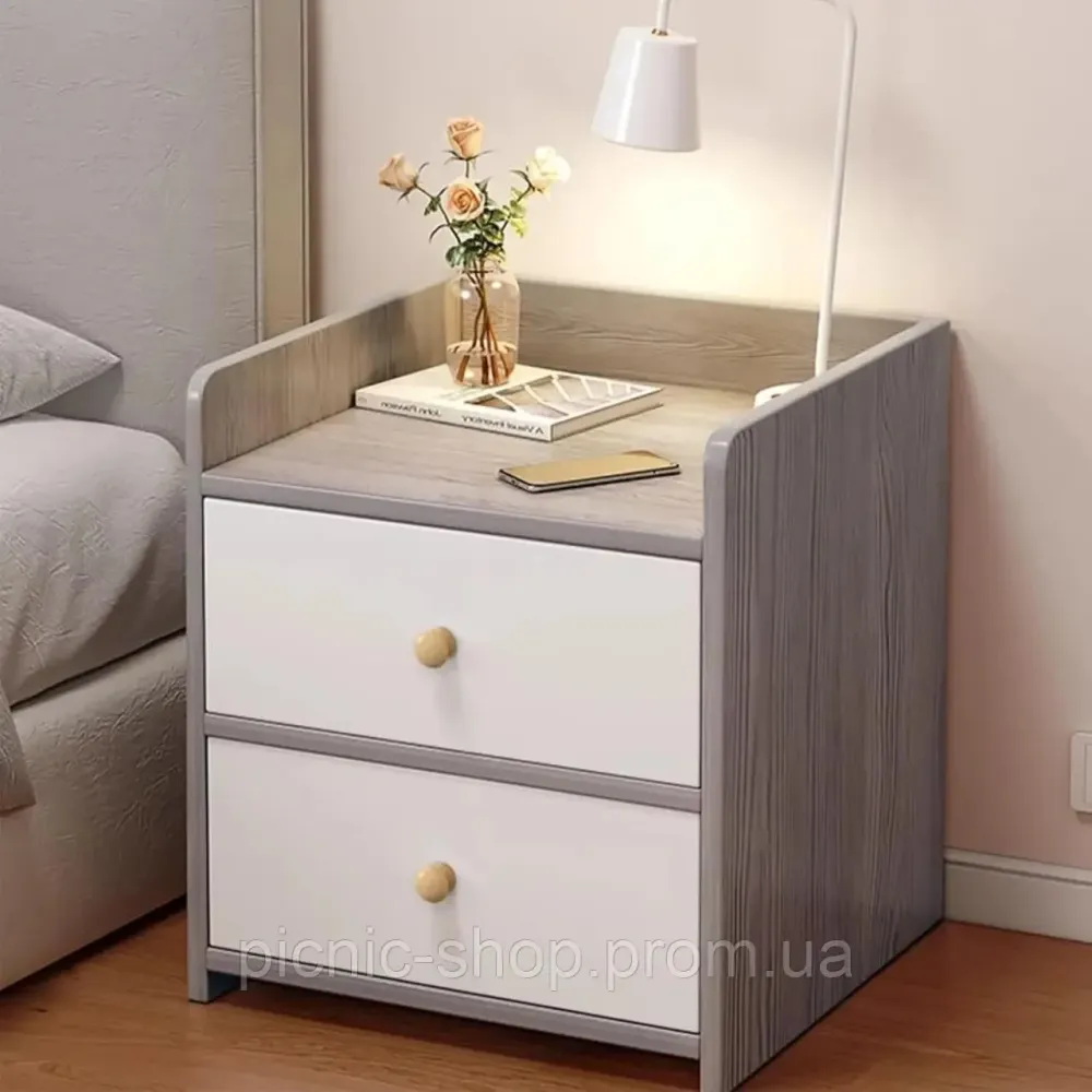 Модель выполнена в универсальном серо-белом цвете, который гармонично впишется в любой интерьер, добавив ему уюта и аккуратности. Один вместительный выдвижной ящик и открытая полка позволяют хранить книги, аксессуары, зарядные устройства или другие мелочи, которые всегда должны быть под рукой.