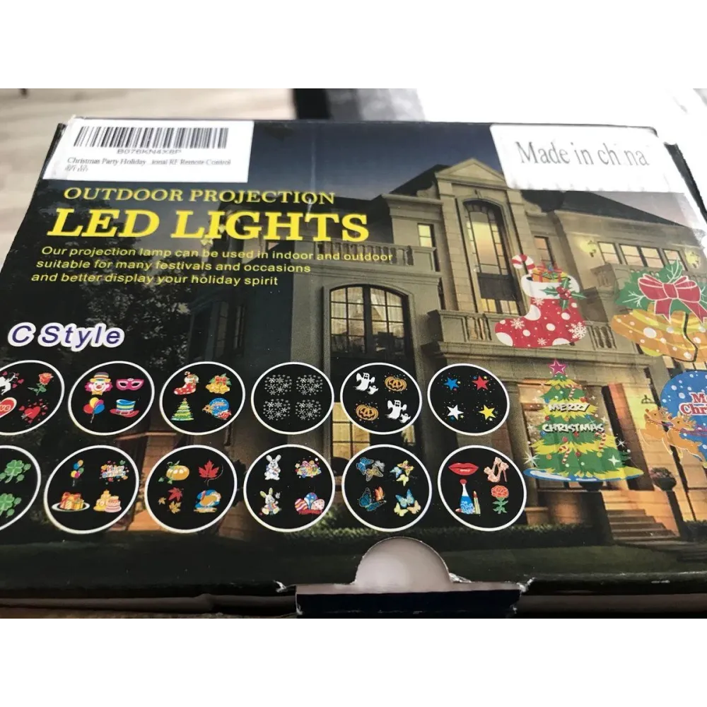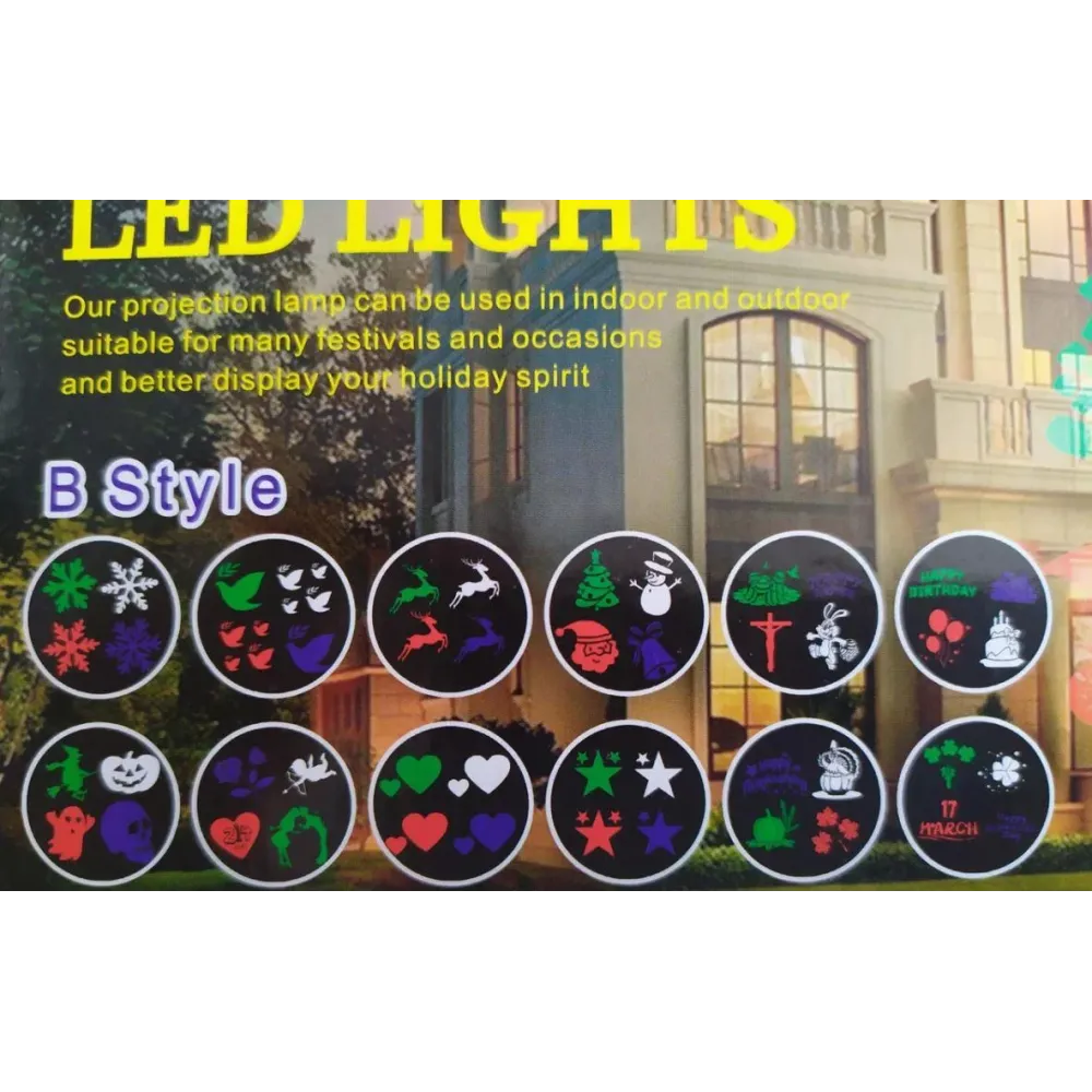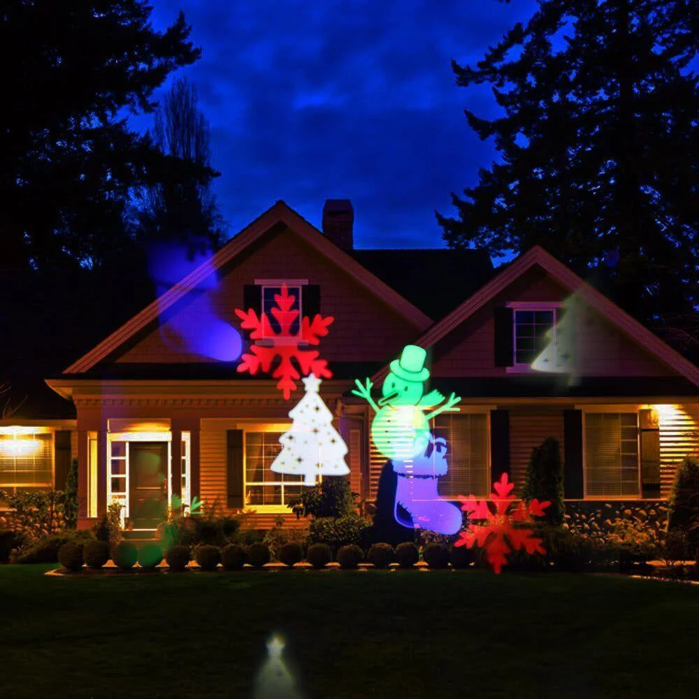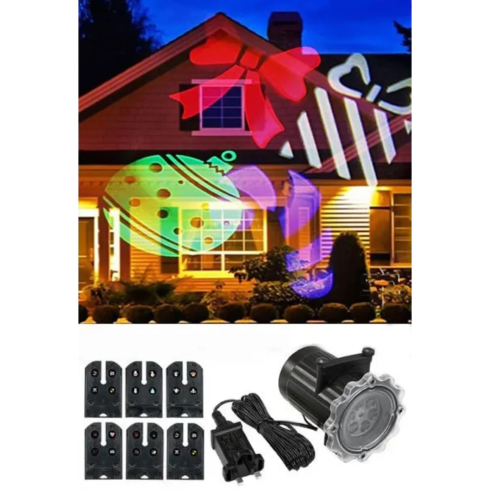 Влагостойкий декорирующий светодиодный проектор Outdoor projection LED Light с 12 картриджами - оригинальный новогодний элемент декора, созданный для применения в как в помещении так и на улице, в любое время года. Универсальный декоративный проектор привнесет в ваше окружение рождественский уют и праздничное настроение. Уличное светодиодное устройство имеет прочный влагозащищенный корпус. Эффект проектора представляет из себя красочную анимацию из бесконечно кружащихся символизирующих Новый год и Рождество картинок, зеленого, красного, белого и синего цветов, что прекрасно подойдет для оформления любого интерьера и новогоднего мероприятия. Имеет разъем для смены картриджей с различными рисунками (12 шт). Проектор прекрасно подойдет для оформления любого интерьера и новогоднего мероприятия.