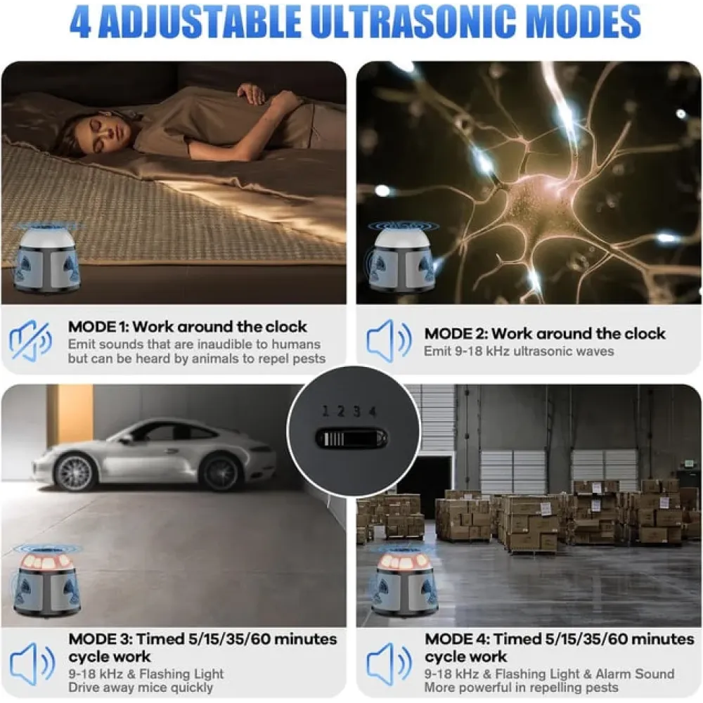 Устройство имеет четыре режима работы, которые легко переключаются в зависимости от потребностей пользователя. Режим 1 — бесшумный, что позволяет использовать устройство, не беспокоя членов семьи. Громкость можно регулировать, что делает прибор универсальным для разных условий. Отпугиватель работает на основе ультразвуковых волн с частотой 18 кГц, которые не слышны человеку, и легко устанавливается в любых помещениях: кухне, спальне, складе, саду или детском саду.
