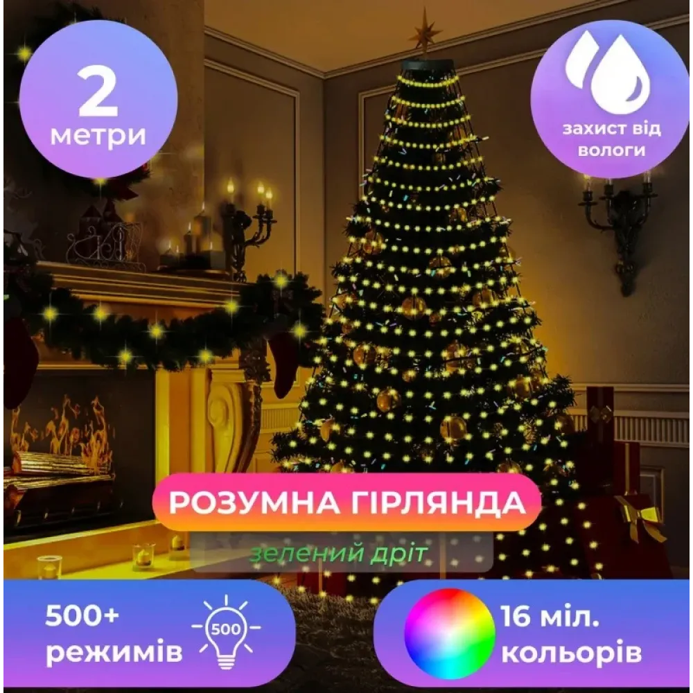 Умная гирлянда Smart 200 LED длиной 2 м с управлением через смартфон – идеальный выбор для современного декора помещений. Благодаря центральному кольцу и 10 нитям со светодиодами, ее легко установить на верхушку елки или использовать в оформлении интерьеров. Гирлянда управляется с помощью специального приложения для смартфона, позволяющего изменять цвета, режимы освещения и яркость. В комплекте входит пульт с предварительно установленными программами. Среди преимуществ — выбор более 16 миллионов цветов и более 500 режимов, которые можно синхронизировать с музыкой.