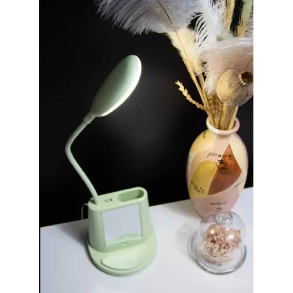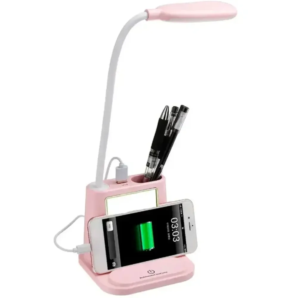 Средняя часть лампы представляет собой органайзер для ручек и карандашей. Так же, на ней находится стандартный USB выход, который можно использовать для зарядки гаджетов (телефона, наушников, смарт часов) или подключения к нему различных USB устройств: мини-вентилятора, доп.светильника, увлажнителя воздуха и т.д. На стыке нижней и средней части LED лампы предусмотрен отсек для установки туда телефона, зеркала, что очень удобно.