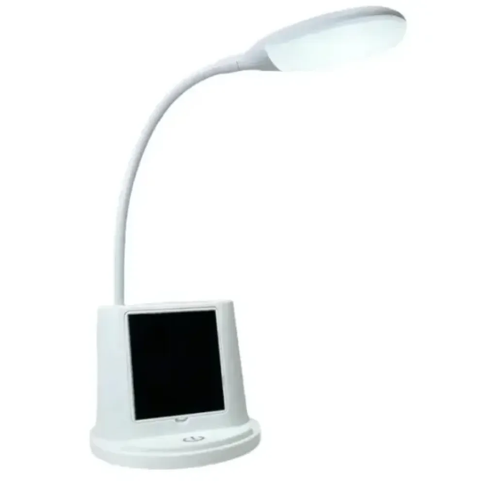 Верхняя часть настольной лампы состоит из гибкой ножки и плафона с экономичными светодиодами которые не греются. Белый матовый рассеиватель дает ровный яркий свет а благодаря гибкой ножке, можно направить поток света в нужное место.