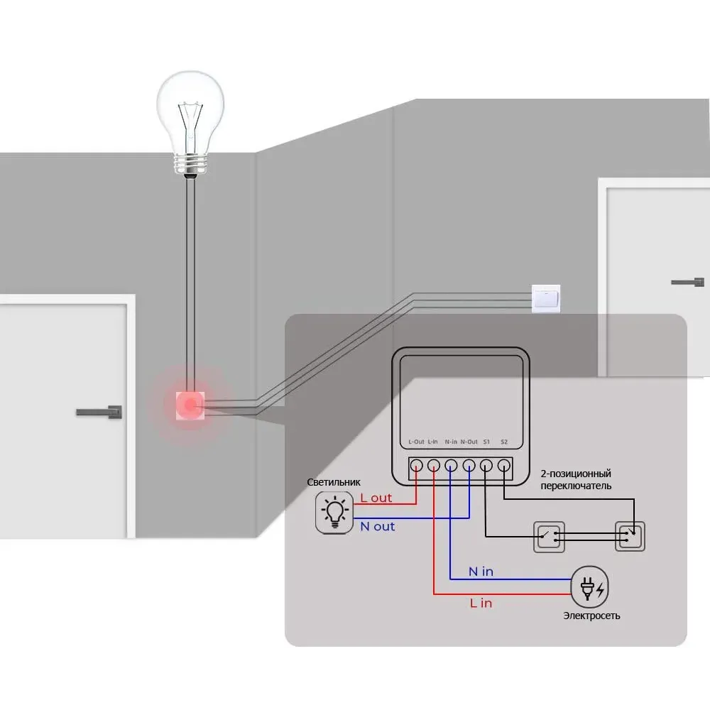 Он монтируется в монтажную коробку обычного выключателя и дублирует функцию включения и выключения. Регулировка яркости происходит через приложение.