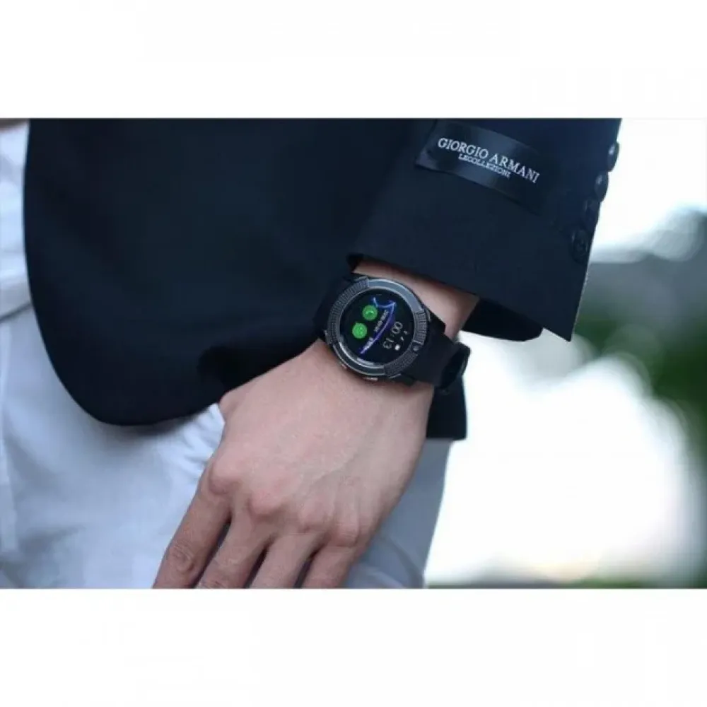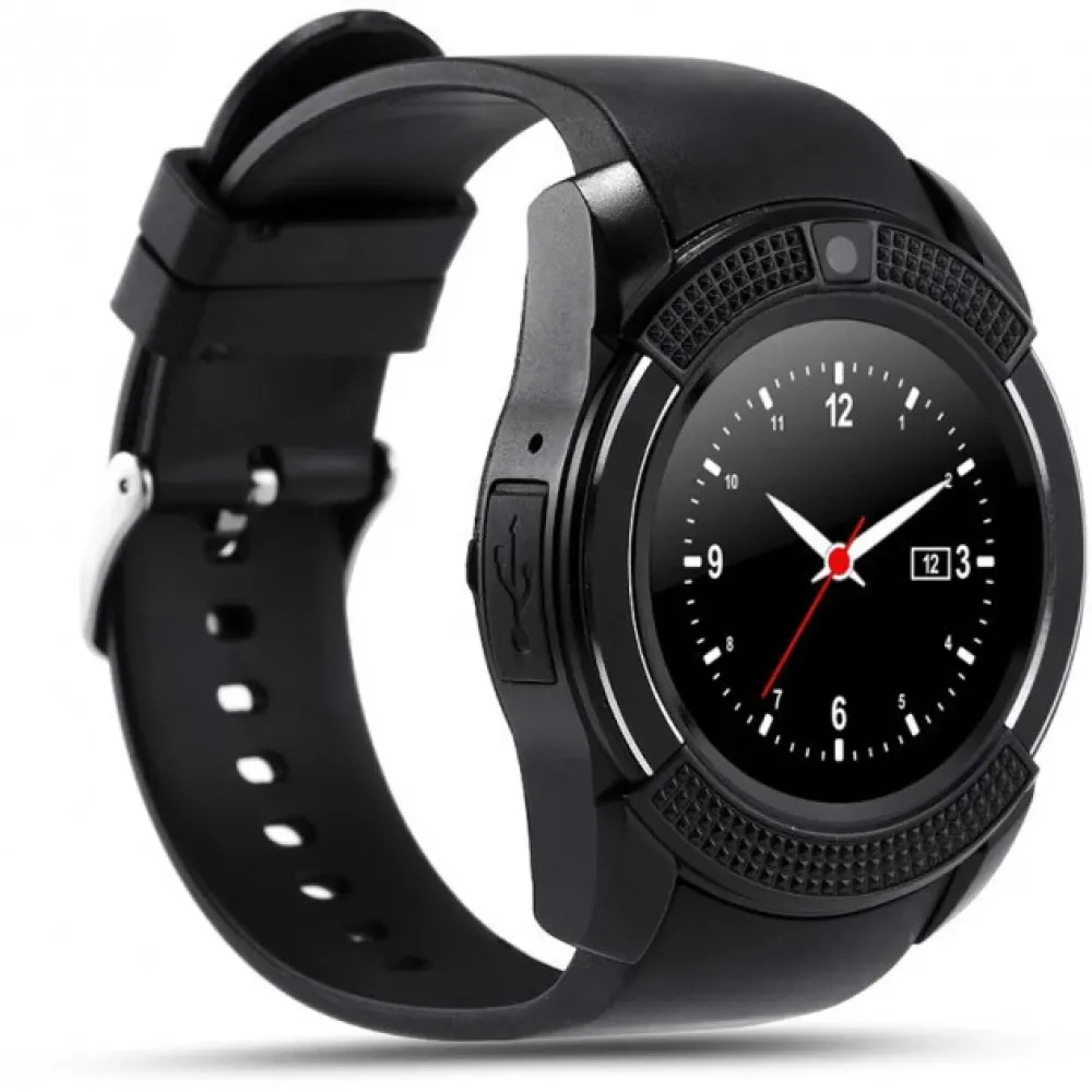 Часы Smart Watch V8 изготавливаются в круглом корпусе. Надо отметить, что последнее время все больше появляется новых моделей часов с круглыми циферблатами. И это хорошо – всегда хорошо, когда есть выбор. Дизайн Smart Watch V8 - ярко выраженный спортивный. Корпус – металлический, ремешок – из гибкого полимера. Современные часы Smart Watch V8 – это умный гаджет с большим набором функций. Меню устройства простое и разобраться в нём сможет даже ребенок. Обзор гаджета показывает, что это модное устройство, без которого не обойтись современному человеку. С левой стороны Smart Watch V8 расположен разъем для зарядки микро-USB, закрытый резиновой заглушкой, с правой – 2 кнопки. Под задней крышкой находятся съемный литиевый аккумулятор, слот для сим карты микро-SIM, а также слот для карты памяти микро-SD. В Smart Watch V8 доступно 3 экранных циферблата, включая классический стрелочный. Функции часов: