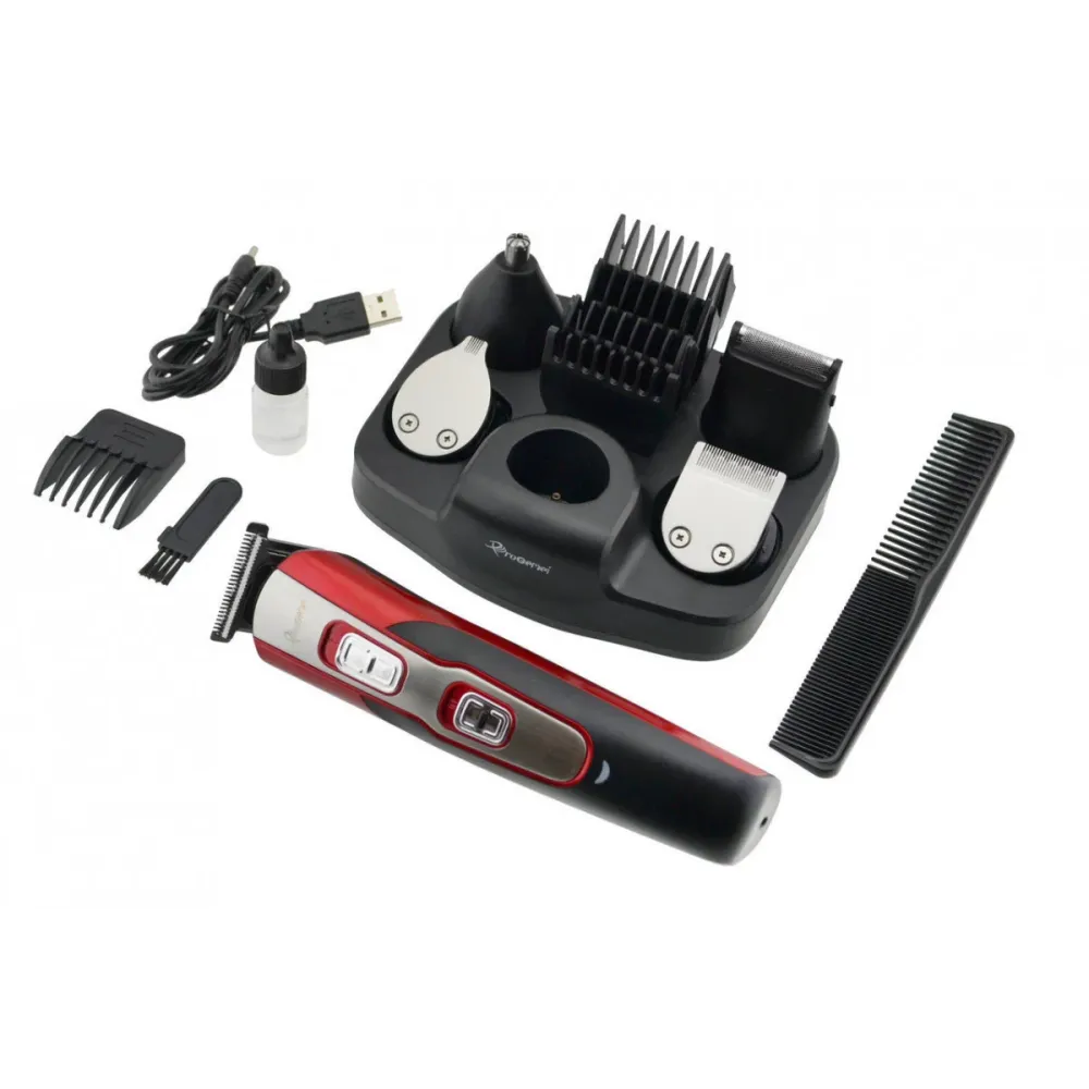 | Универсальный набор для стрижки волос сочетает в себе бритву, триммер для носа и ушей, машинку для стрижки с 4 сменными насадками (3mm, 6mm, 9mm, 12mm), насадку для подравнивания бороды и бакенбард. | |