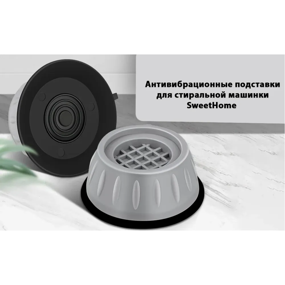 Антивибрационные подставки для стиральной машинки SweetHome поглощают вибрации стиральной или сушильной машины, позволяя технике устойчиво стоять на полу. Это универсальные силиконовые амортизирующие подставки для стиральных машин. Данные подушки для ножек стиральной машины нужны для того, чтобы снизить ее вибрацию во время процесса стирки. Также, помимо снижения колебания машинки, подставки выполняют еще и другие функции. Они не дают скользить стиральной машинке по полу, не дают ей прыгать, а также снижают уровень шума. Тем самым защищают пол от царапин.