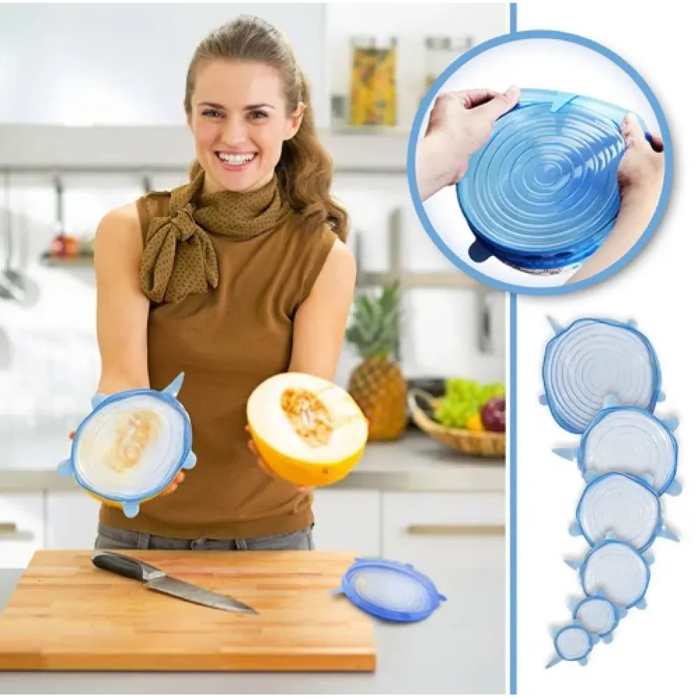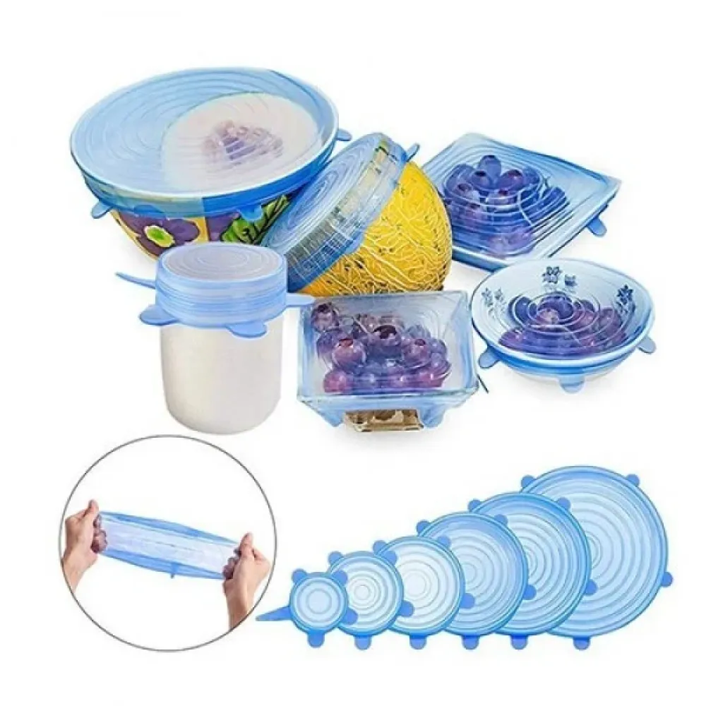 Силиконовые крышки универсальные Super stretch silicone lids 6 шт изготовлены из пищевого силикона и служат долгие годы. Принцип работы: силиконовые крышки отлично растягиваются и принимает любую форму, а это значит, что изделие может, одевается не только на круглые, но и овальные, квадратные емкости. С силиконовыми крышками вы можете: герметично закрывать любые кастрюли, сковородки, тарелки, стаканы или контейнеры с едой. Запаковывать недоеденные фрукты и овощи для более длительного хранения. Изделие легко моется и подходит для всех видов посуды!