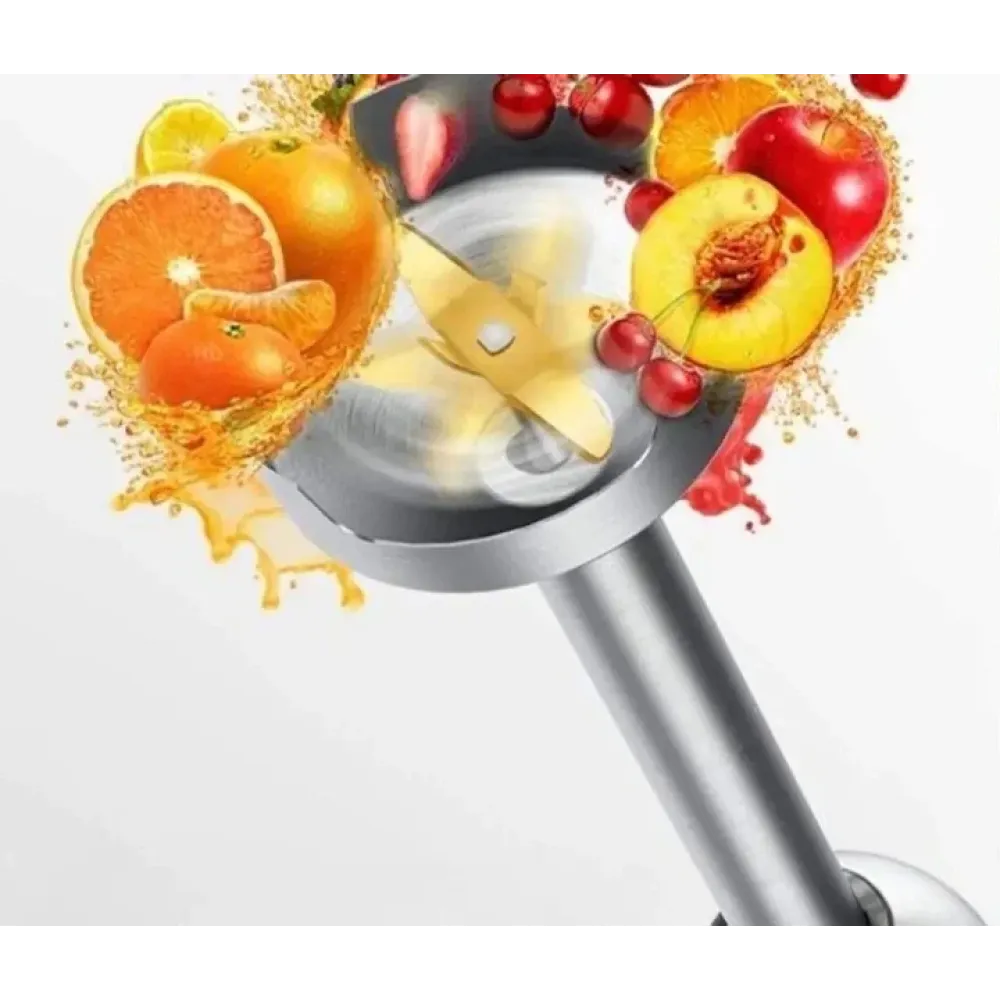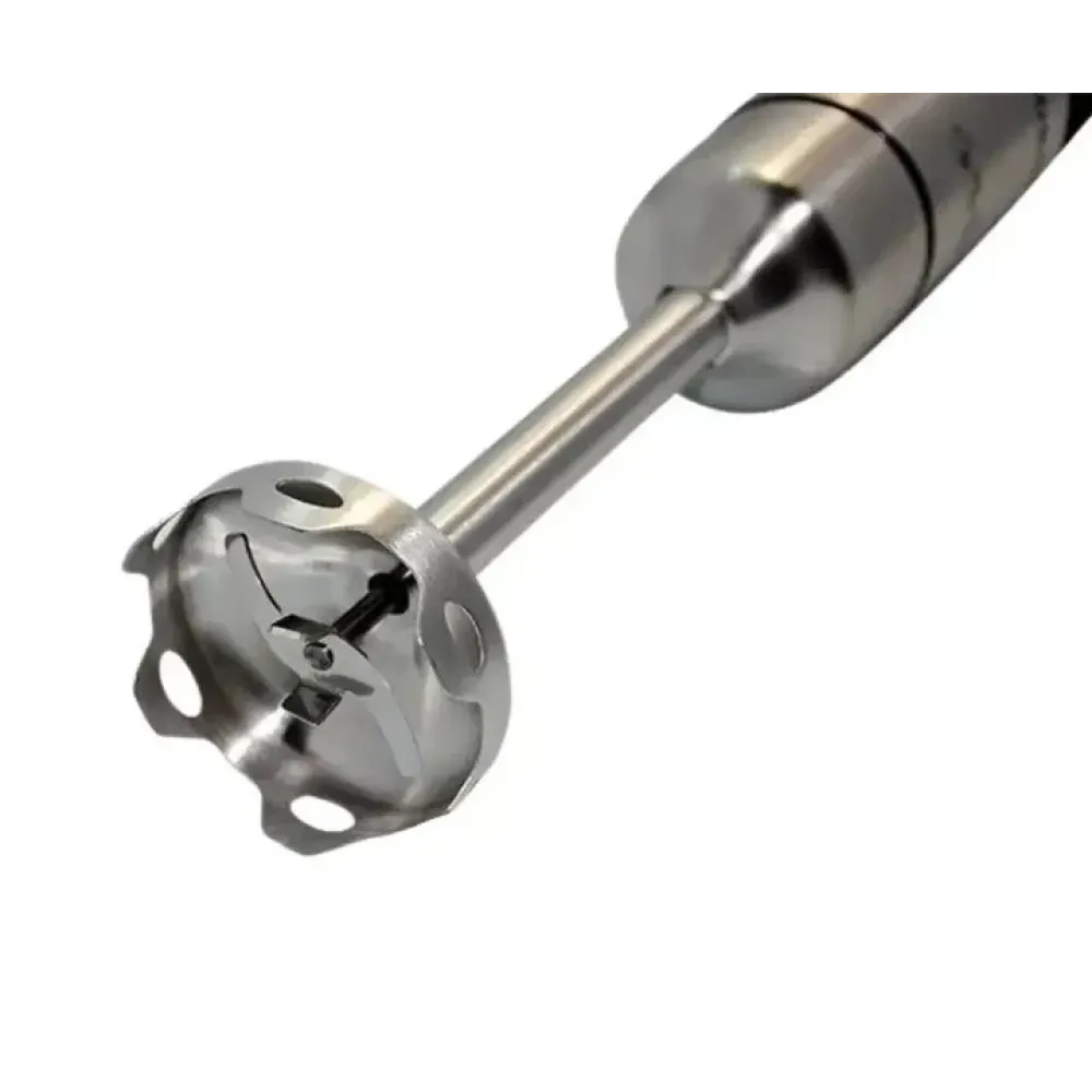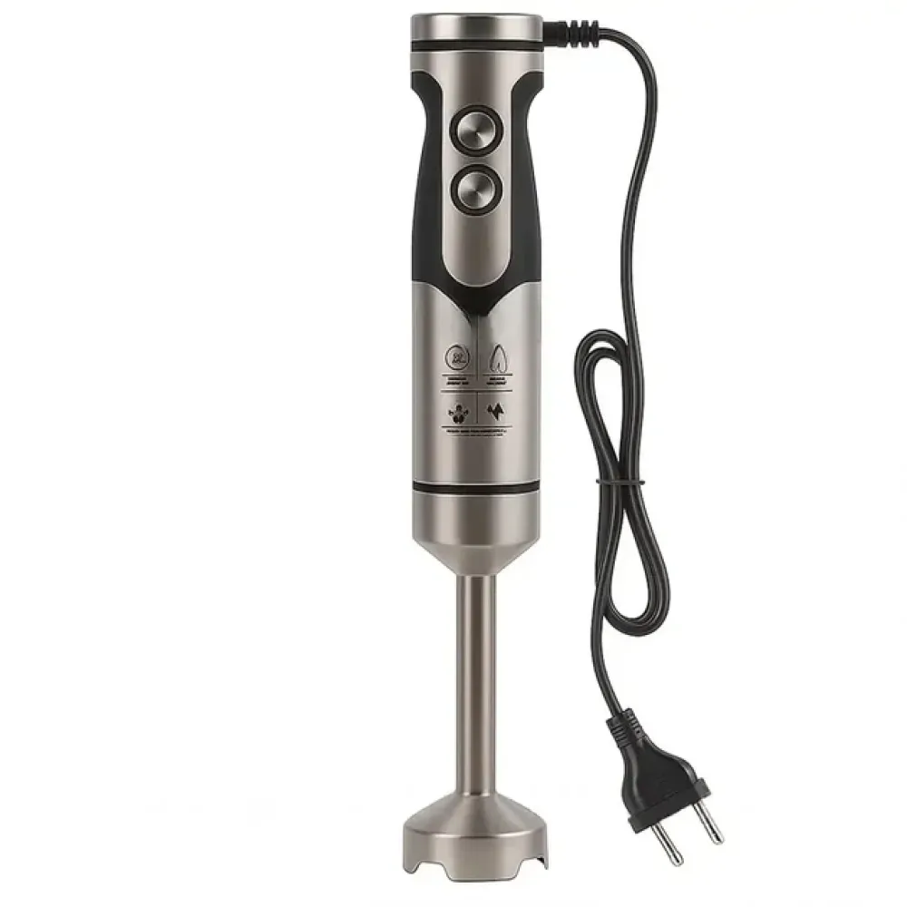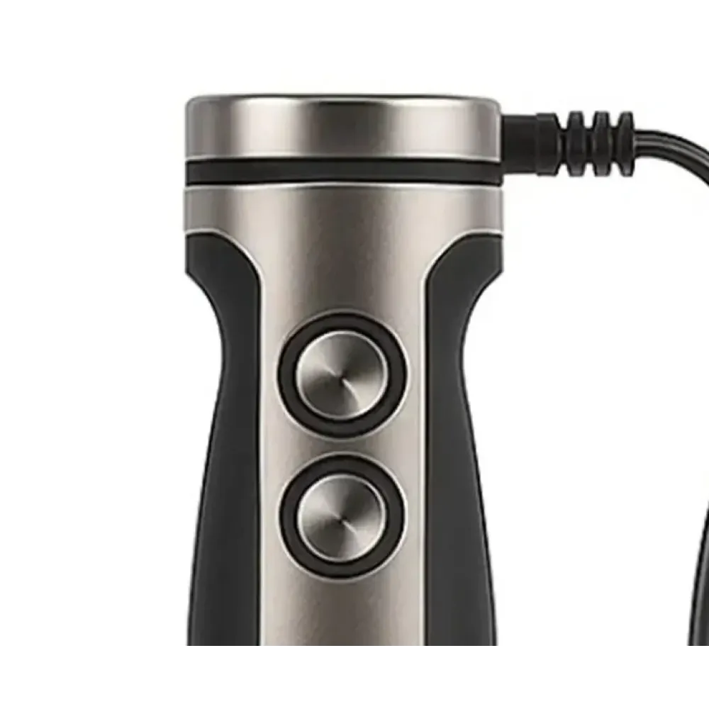 Металлическая погружная часть гарантирует долговечность и позволяет работать с горячими ингредиентами. Корпус сочетает металл и пластик, что обеспечивает стильный внешний вид и удобство эксплуатации. Эргономичная ручка и компактный размер делают блендер удобным и безопасным в использовании.