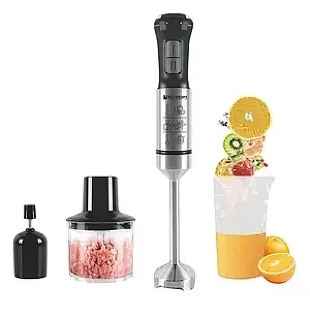 Погружной блендер Hoffmans 5в1 HM-8047 — многофункциональный кухонный прибор, объединяющий 5 насадок для смешивания, измельчения, взбивания и приготовления смузи. Он идеально подходит для ежедневного использования дома и помогает быстро готовить супы-пюре, соусы, коктейли, кремы и десерты, а также измельчать овощи, фрукты, орехи и сыр.