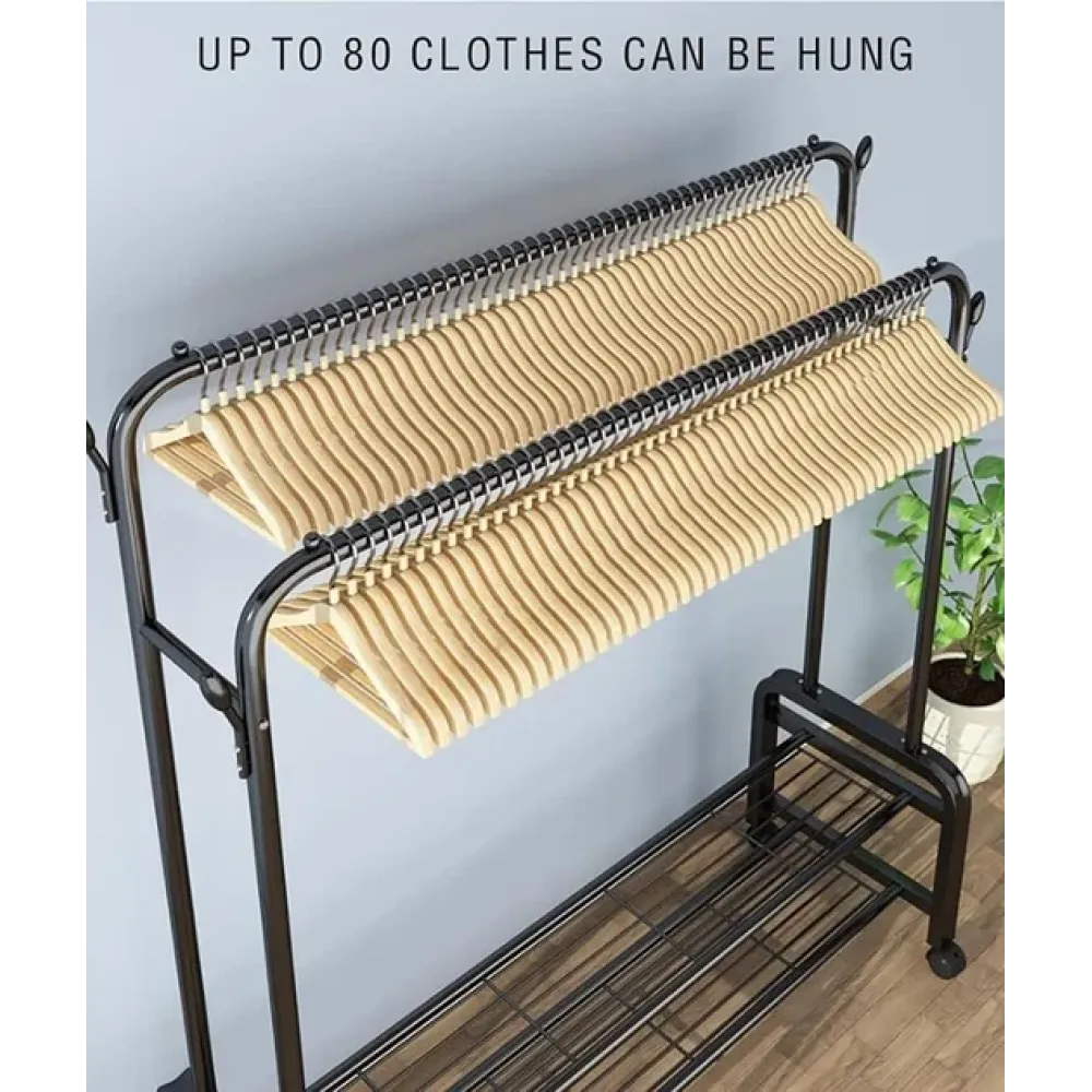 Поделение на две секции позволяет удобно хранить как одежду, так и обувь, оптимизируя пространство и поддерживая порядок. Черный цвет придает стойке стильный и элегантный вид, делая её функциональным и эстетически привлекательным элементом интерьера. Multipurpose Hanger — универсальное решение для хранения одежды и обуви, обеспечивающее порядок и организацию в комнате.
