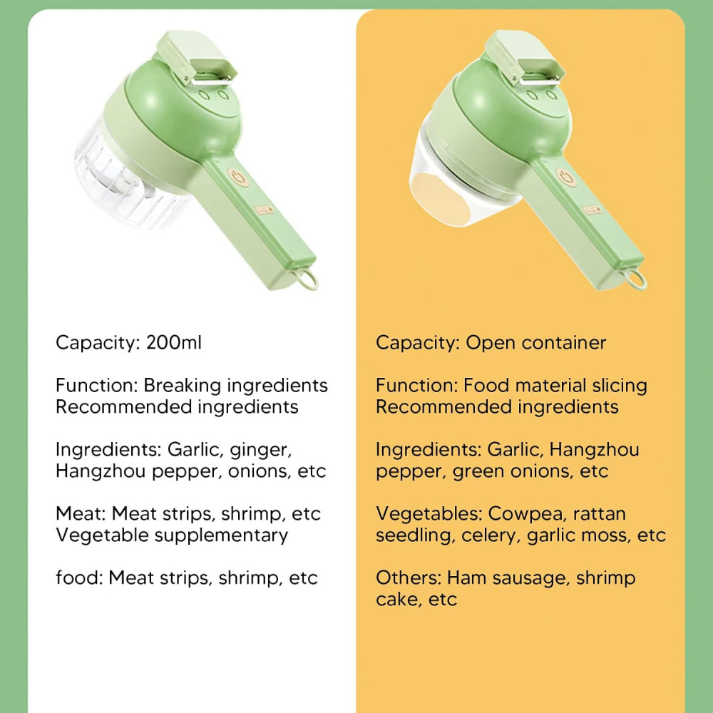 Электрический измельчитель 4 в 1 — незаменимый помощник на вашей кухне. Компактный, удобный в использовании и простой в очистке, он позволяет быстро измельчать овощи, фрукты и другие продукты. Эргономичная ручка обеспечивает комфорт при работе, а острые лезвия из нержавеющей стали гарантируют эффективное и ровное нарезание