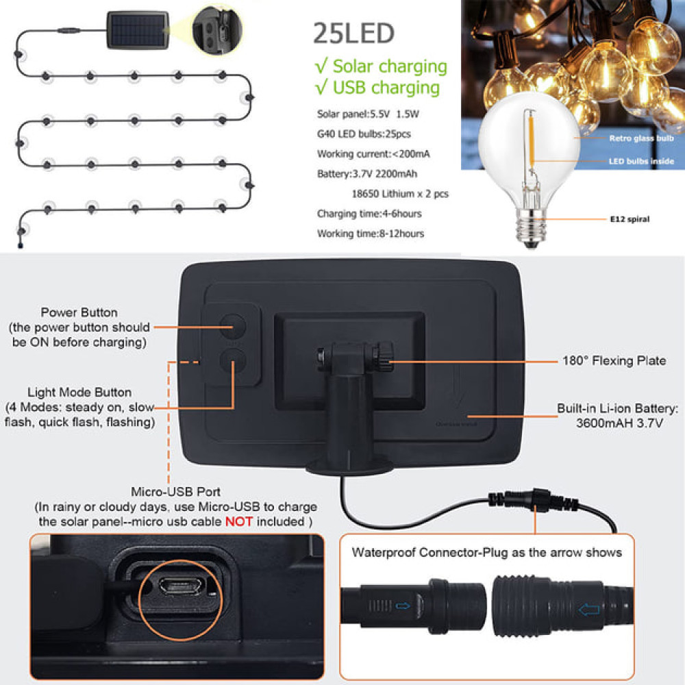 Садовая гирлянда длиной 10 метров с 20 светодиодами и солнечной батареей — это удобное и экологичное решение для праздничного и уличного освещения. Устройство работает автономно, не требует подключения к электросети, а встроенный аккумулятор емкостью 1200 mAh обеспечивает продолжительное свечение до 8–10 часов.